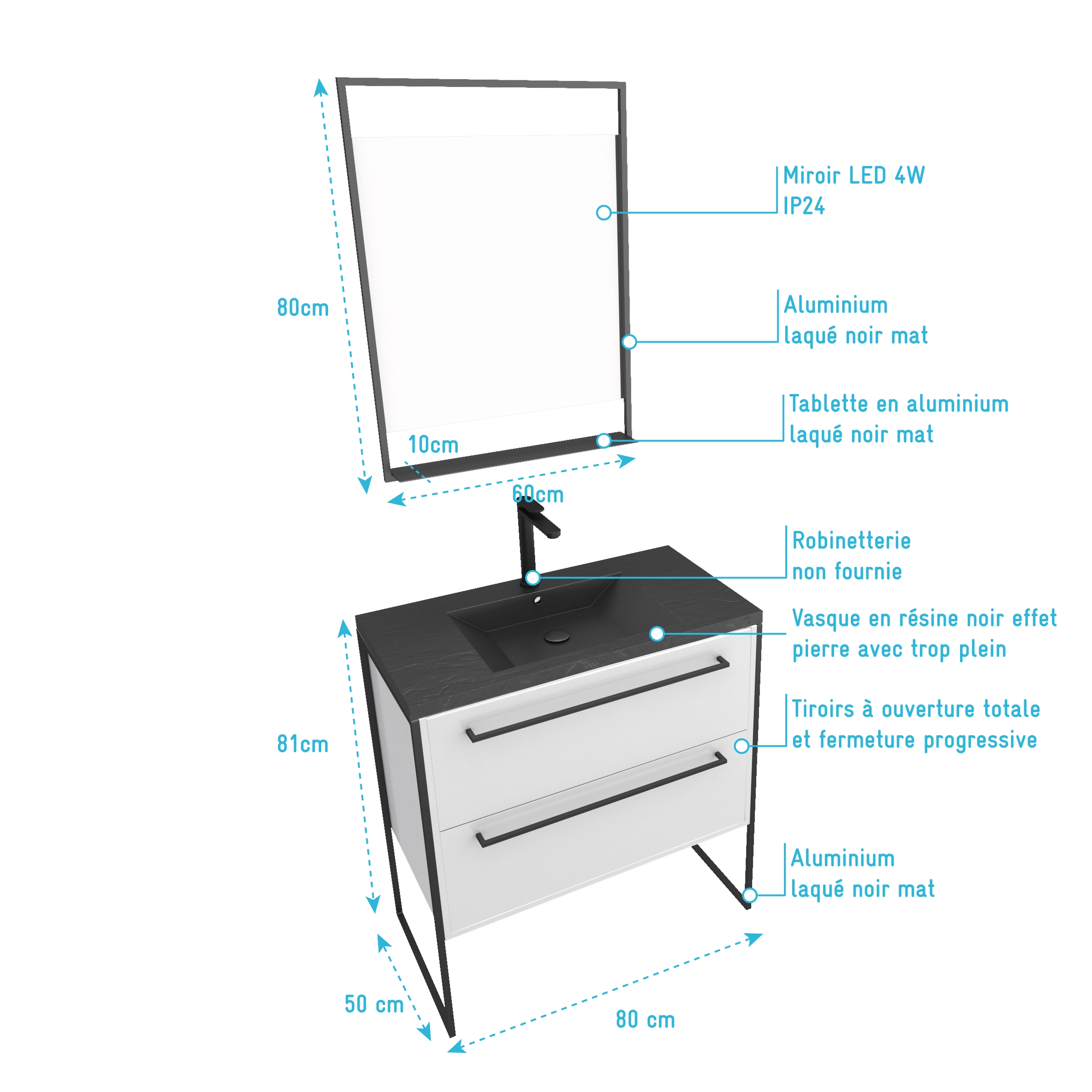 Pack meuble de salle de bain 80x50cm Blanc – 2 tiroirs – vasque resine noire effet pierre – miroir