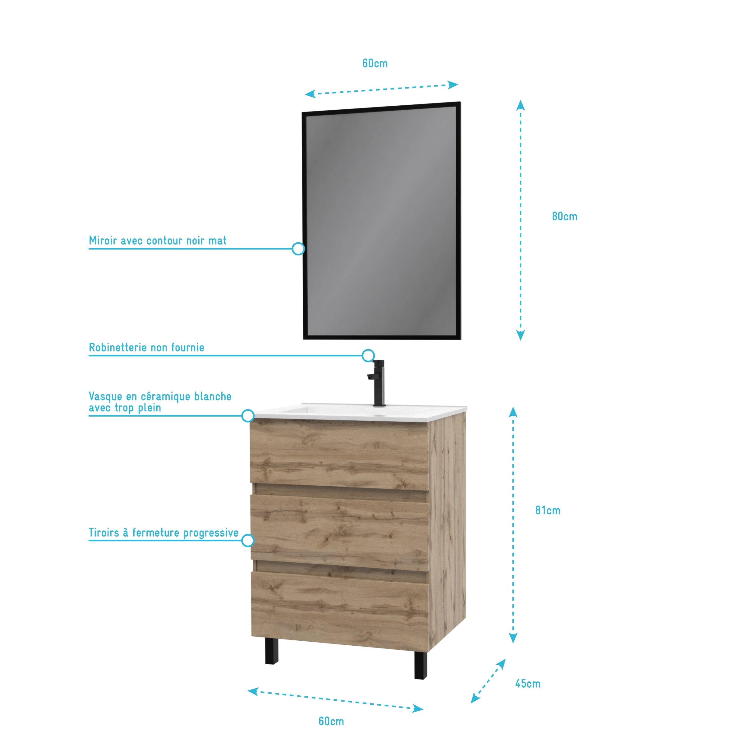Meuble salle de bain 60 x 80 – Finition chene naturel + vasque blanche + miroir – TIMBER 60 – Pack15