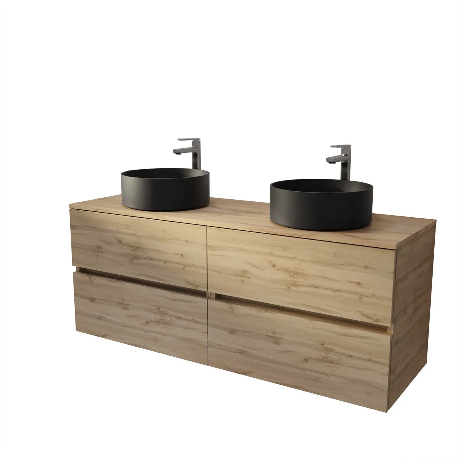 Meuble de salle de bains 140 TIMBER Décor Chêne – 4 Tiroirs – 2 Vasques Rondes Noires 36cm