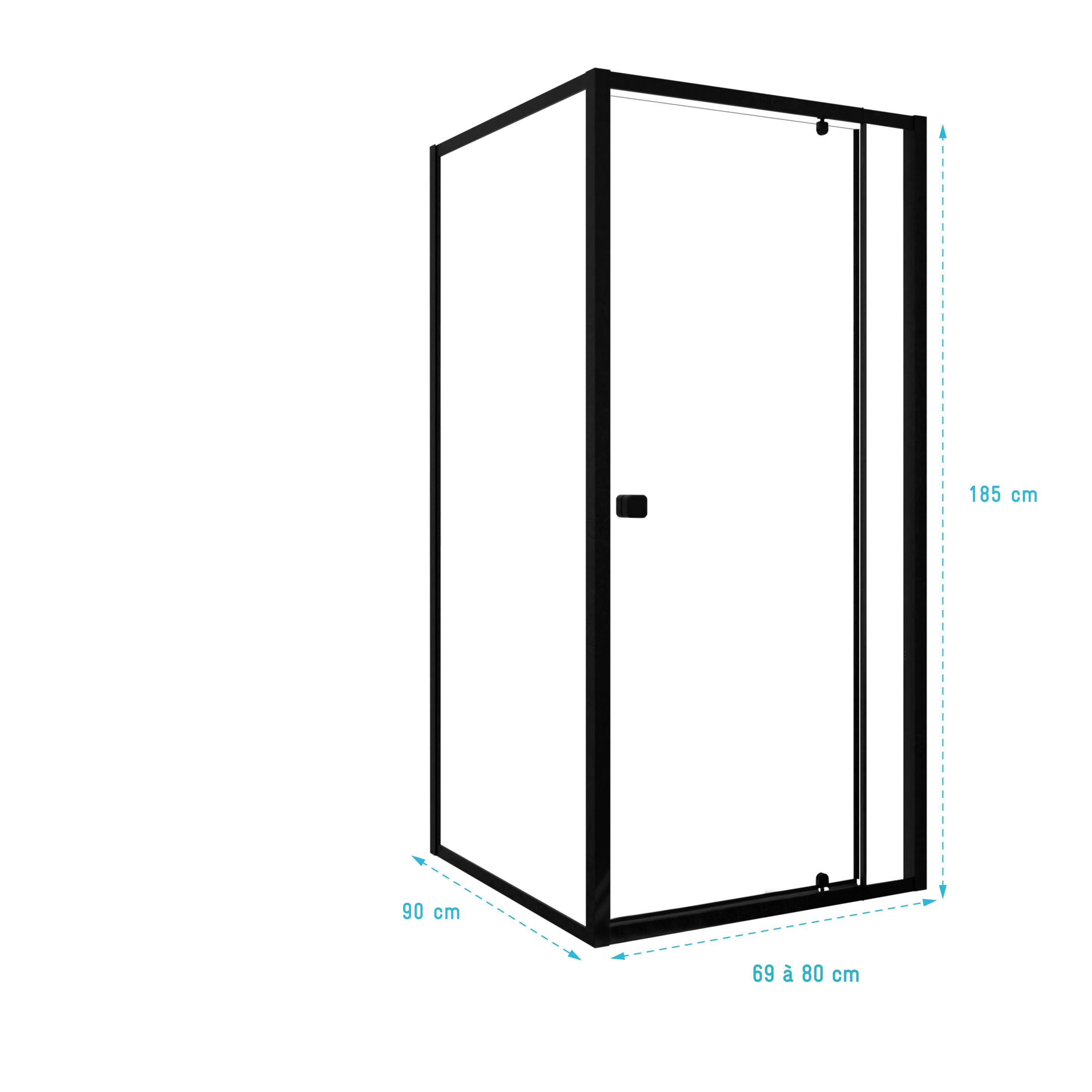 Porte de Douche Pivotante 80x195cm et Retour 90cm - Verre 8mm Anticalcaire - Profil Noir
