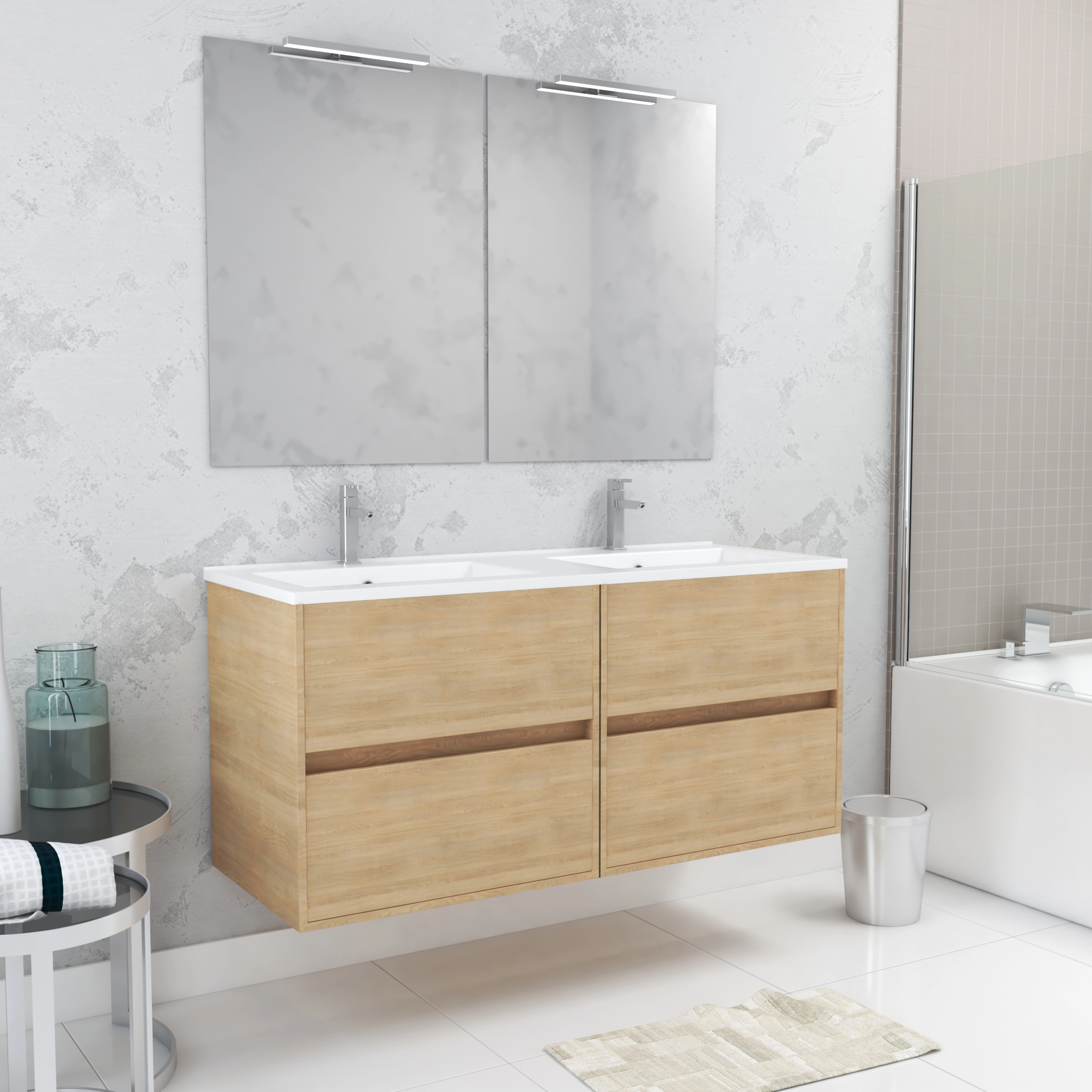 Le meuble double vasque, à partir de 120 cm, est parfait pour les familles ou les couples qui souhaitent gagner du temps le matin. Ses tiroirs, vasques et accessoires permettent à deux personnes d’utiliser la salle de bain simultanément. C’est aussi un élément qui structure la pièce, en lui apportant du volume et du cachet.