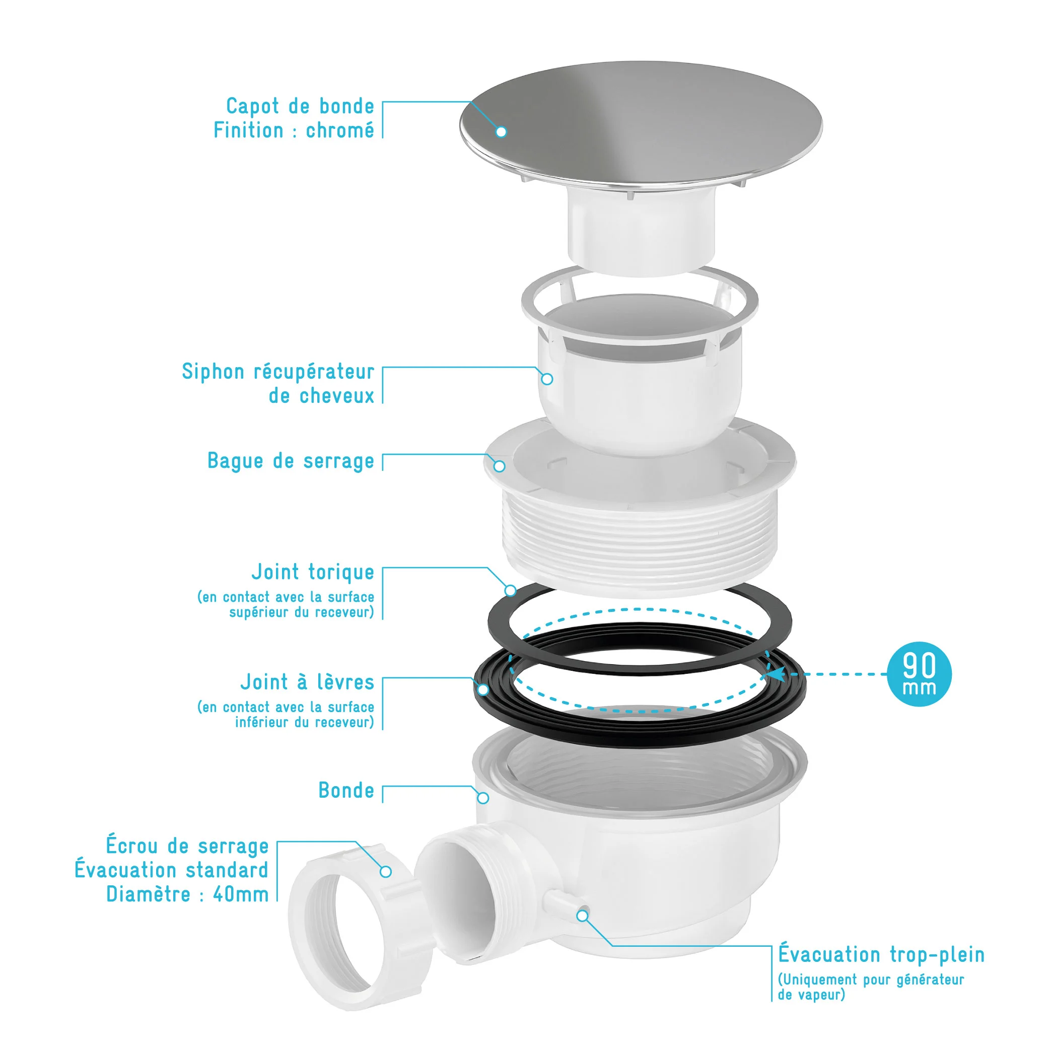Bonde de Receveur Diamètre 90 mm – Capot Chrome – Evacuation Horizontale