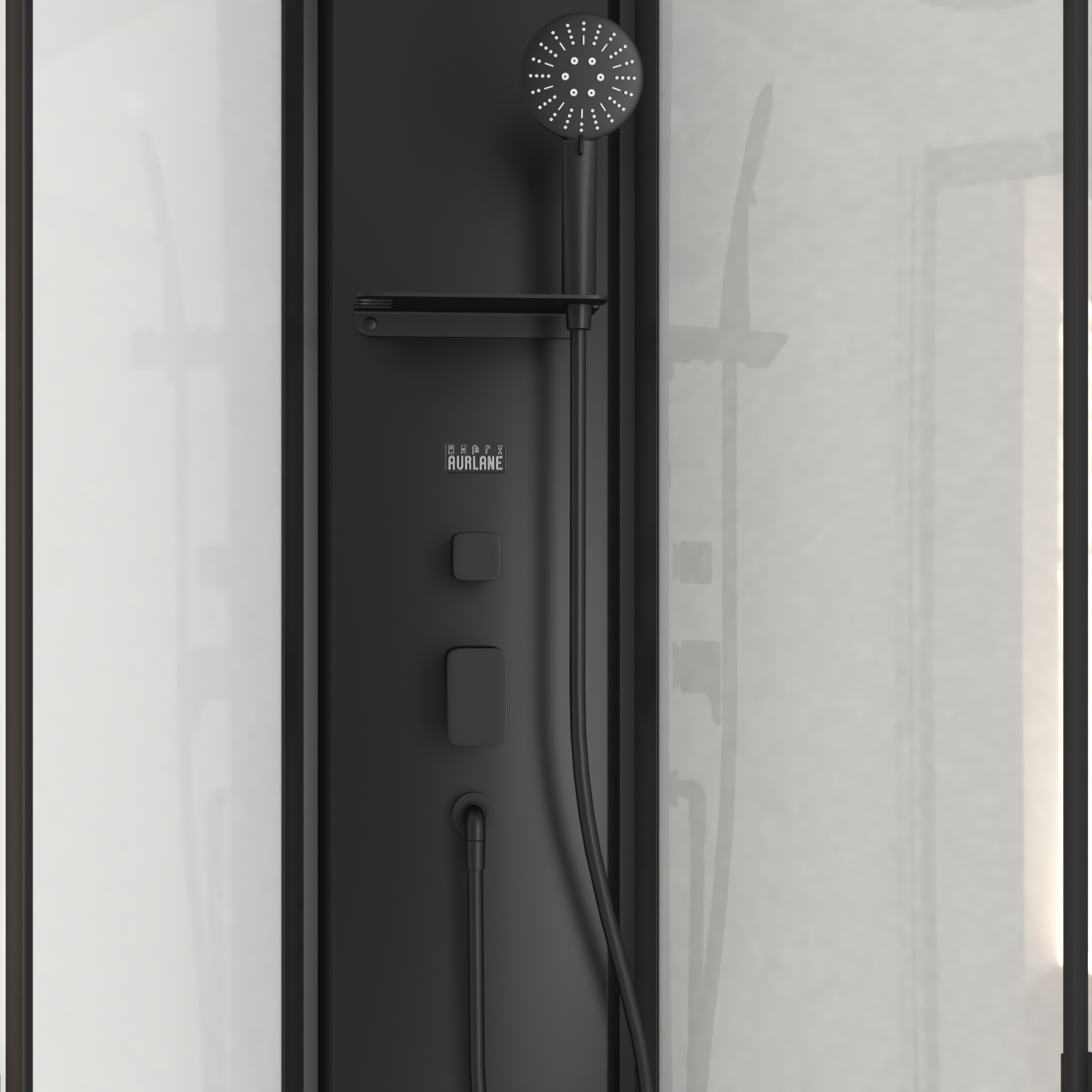 Les fonds en verre trempé blanc et la colonne hydro noire colorent sobrement la cabine. La structure en aluminium laqué noir mat souligne tout en finesse le design de la cabine de douche LIFT UP 3.