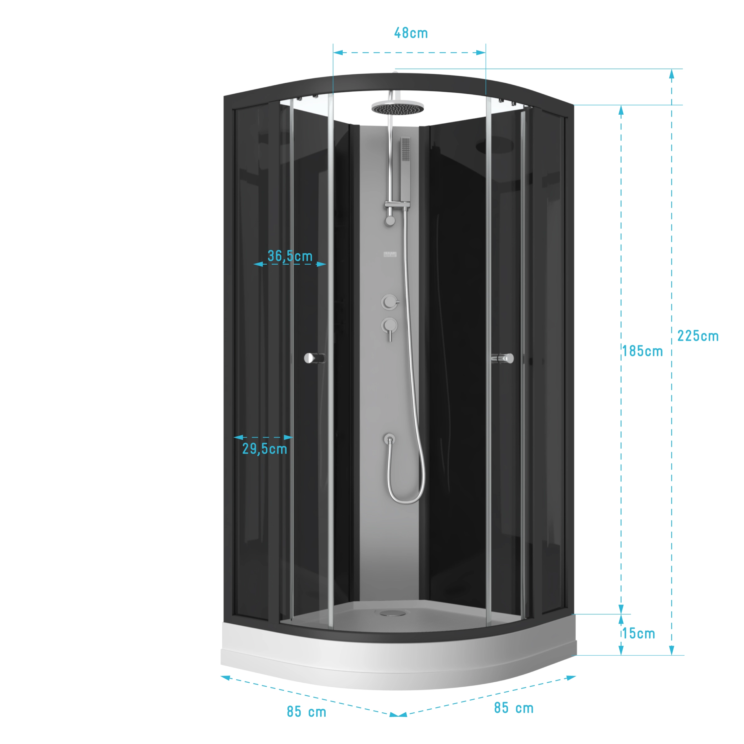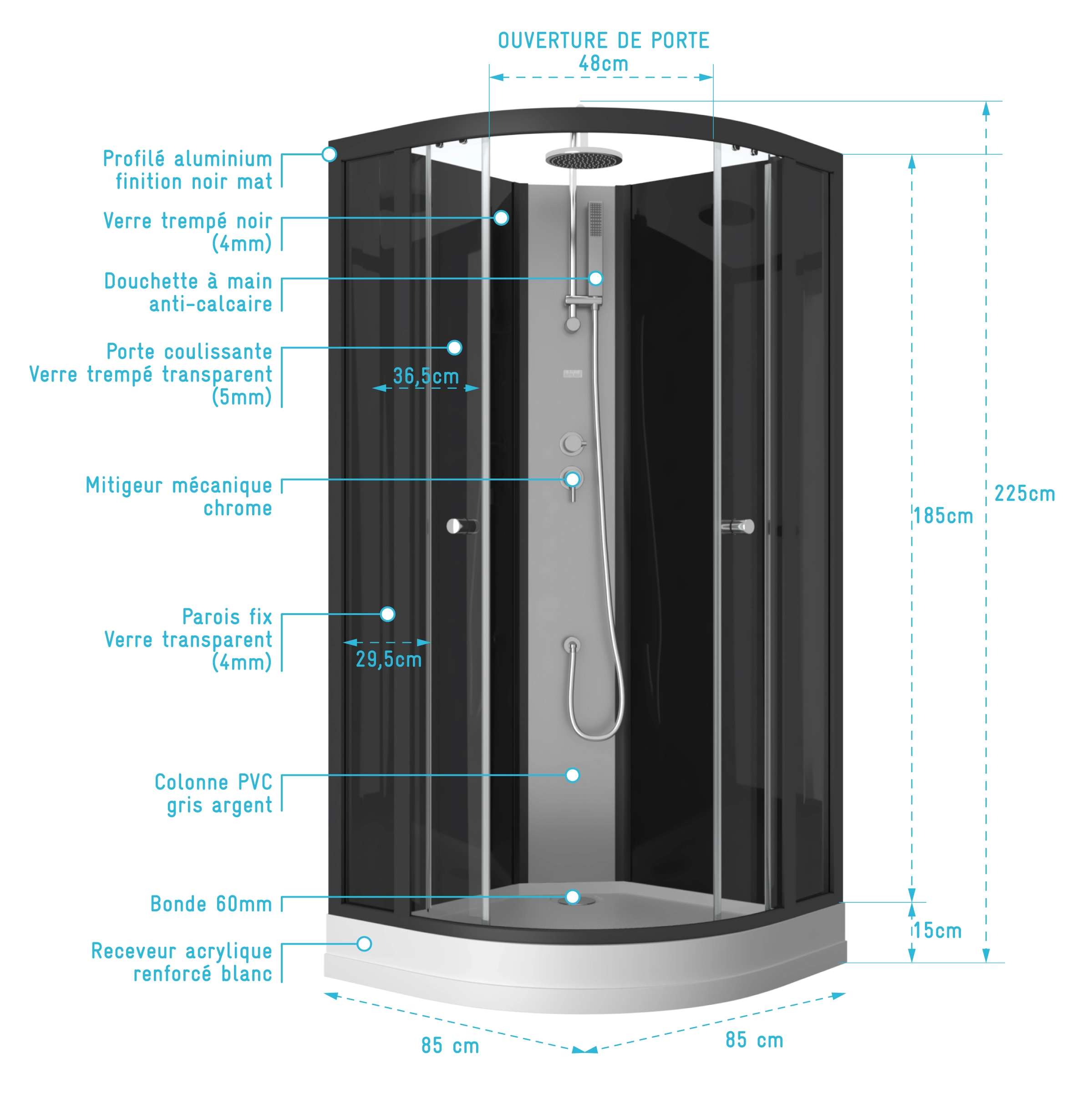 15 avis pour Cabine de douche 1/4 de cercle 85x85x225cm – NEBULA