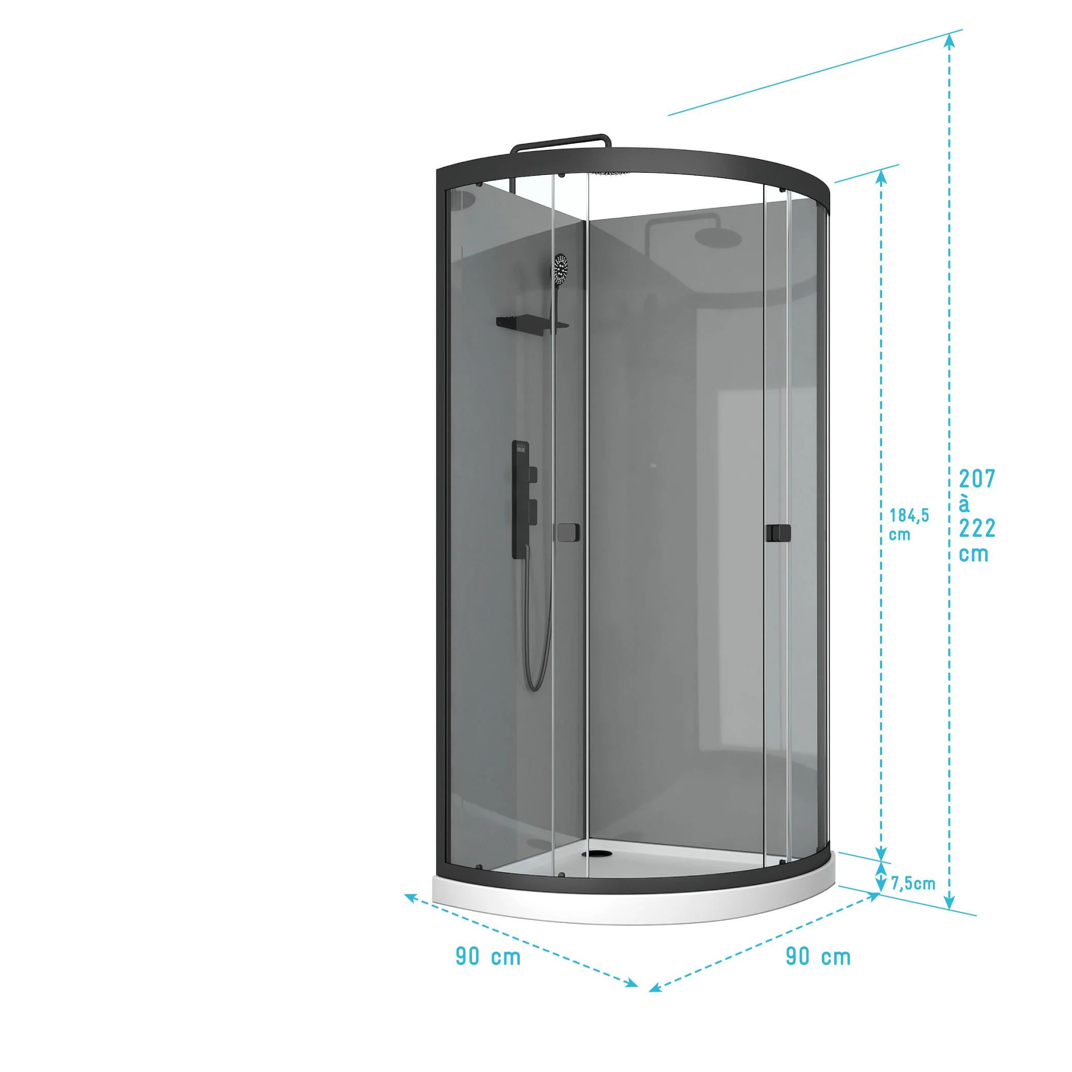3 avis pour Cabine de douche 1/4 de cercle 90x90x207/222 cm – Receveur bas – Fonds Gris Profilés Noir Mat – FOGGY LOW