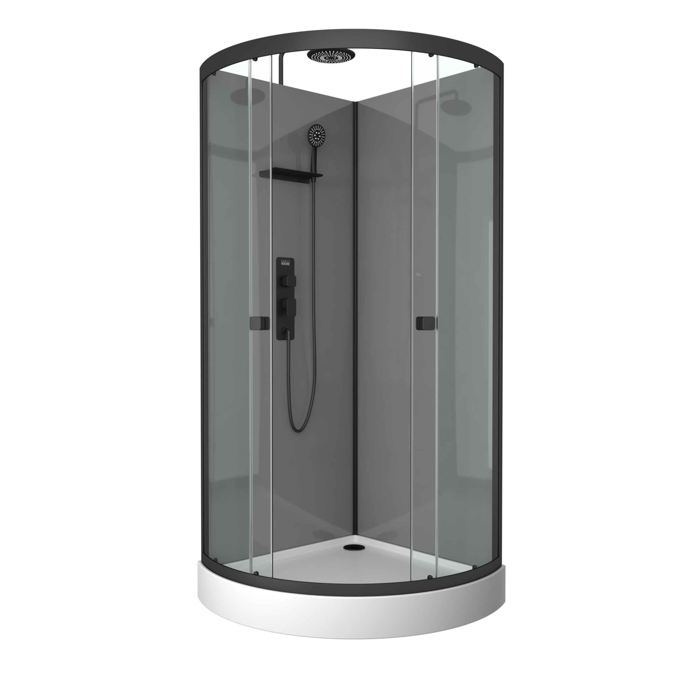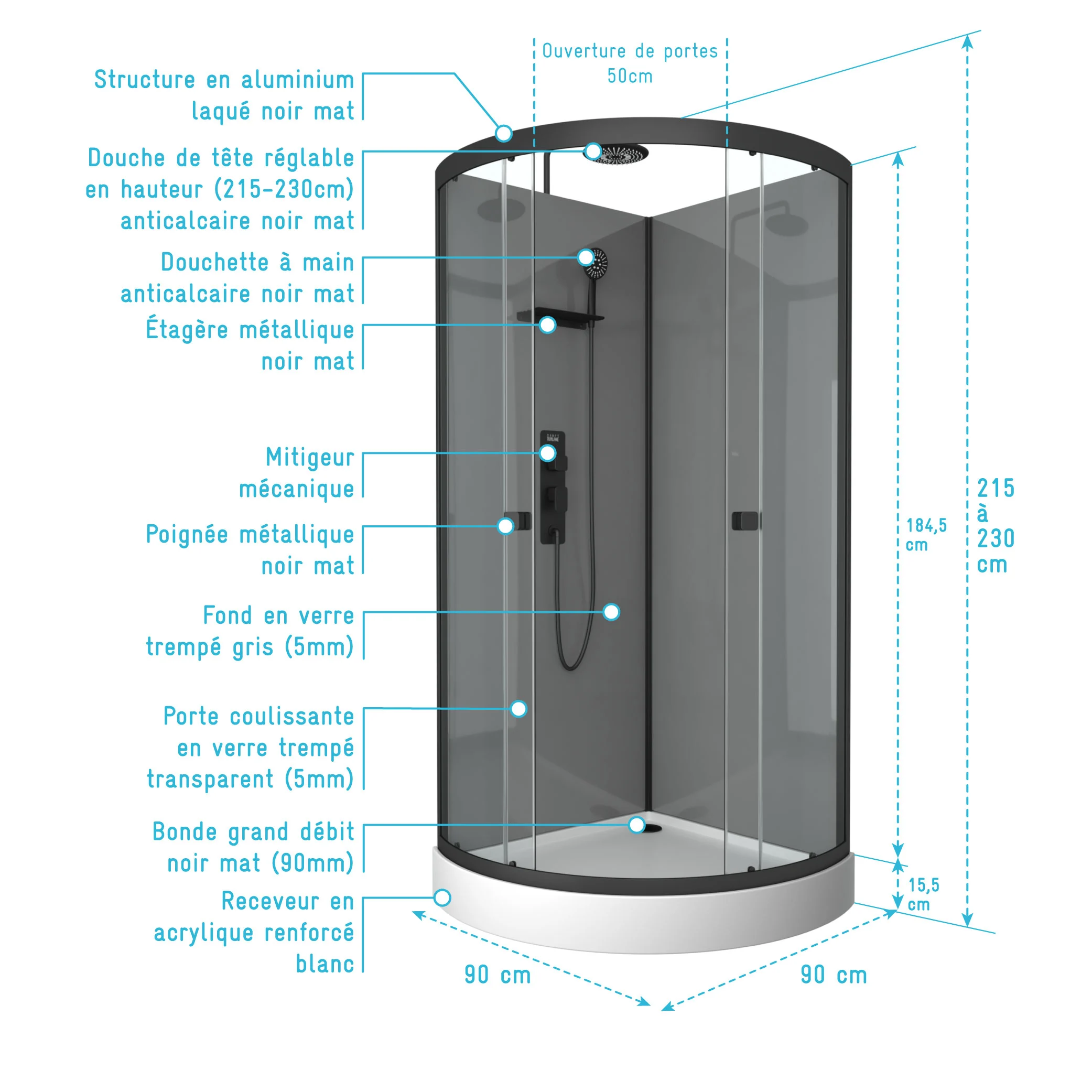6 avis pour Cabine de douche 1/4 de cercle 90x90x215/230 cm – Fonds Gris Profilés Noir Mat – FOGGY
