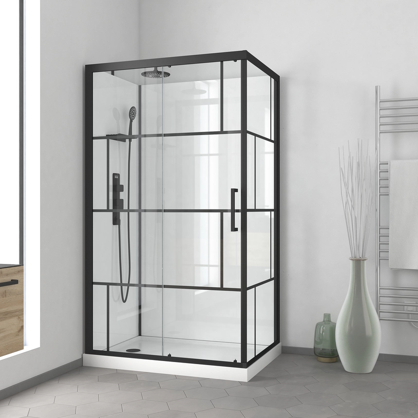 1 avis pour Cabine de douche 110x80cm / Receveur Bas – Verre transparent sérigraphié et Blanc – Profilés Noir