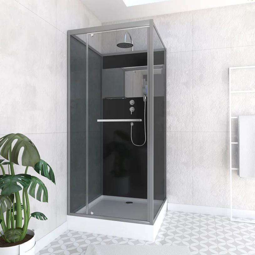10 avis pour Cabine de Douche Carrée 90x90cm Porte Pivotante – Fond Noir avec bande effet miroir – SQUARE STRIPE