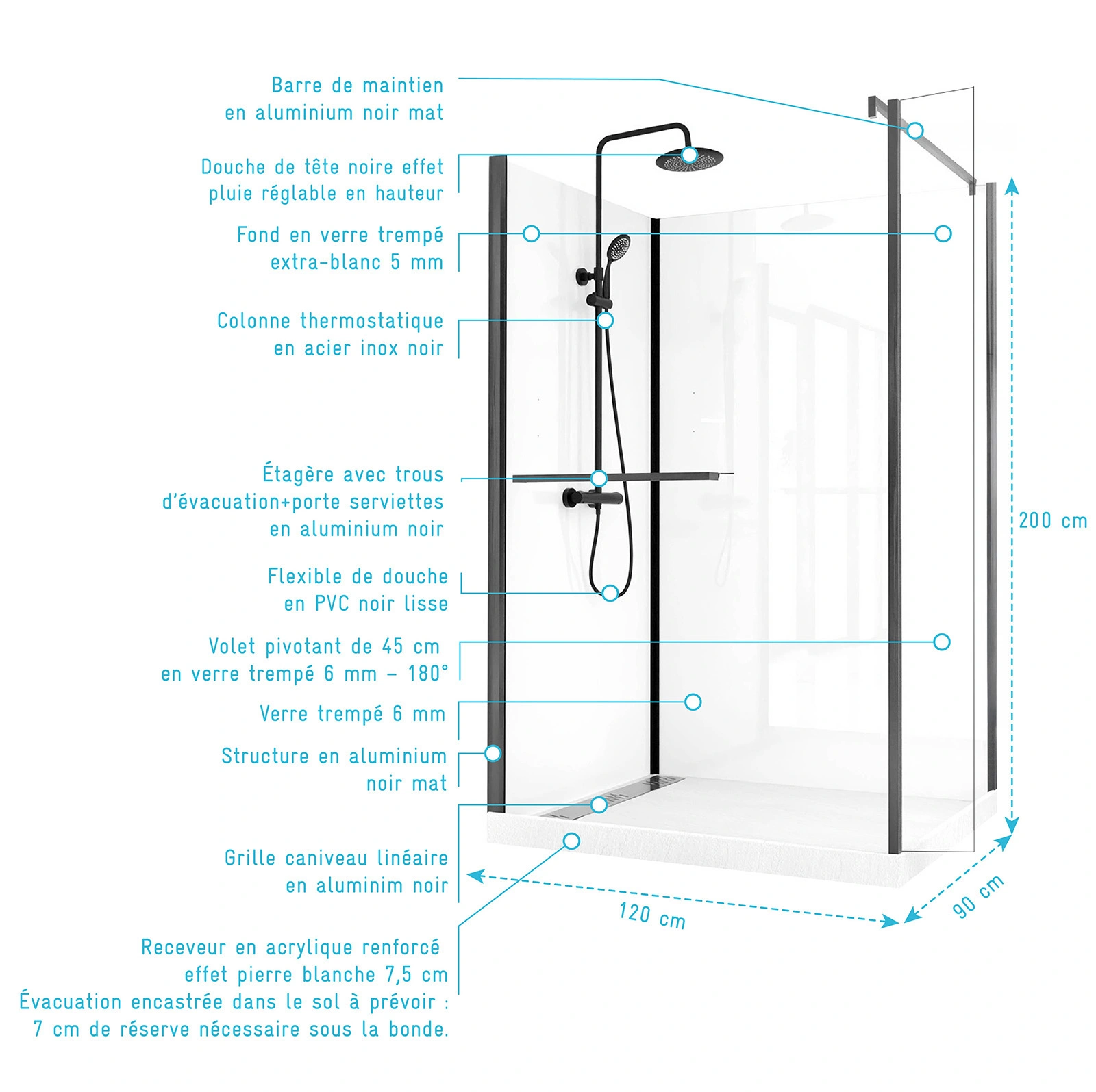 - Hauteur receveur + paroi + douche de tête : Ajustable de 200 à 237.5 cm