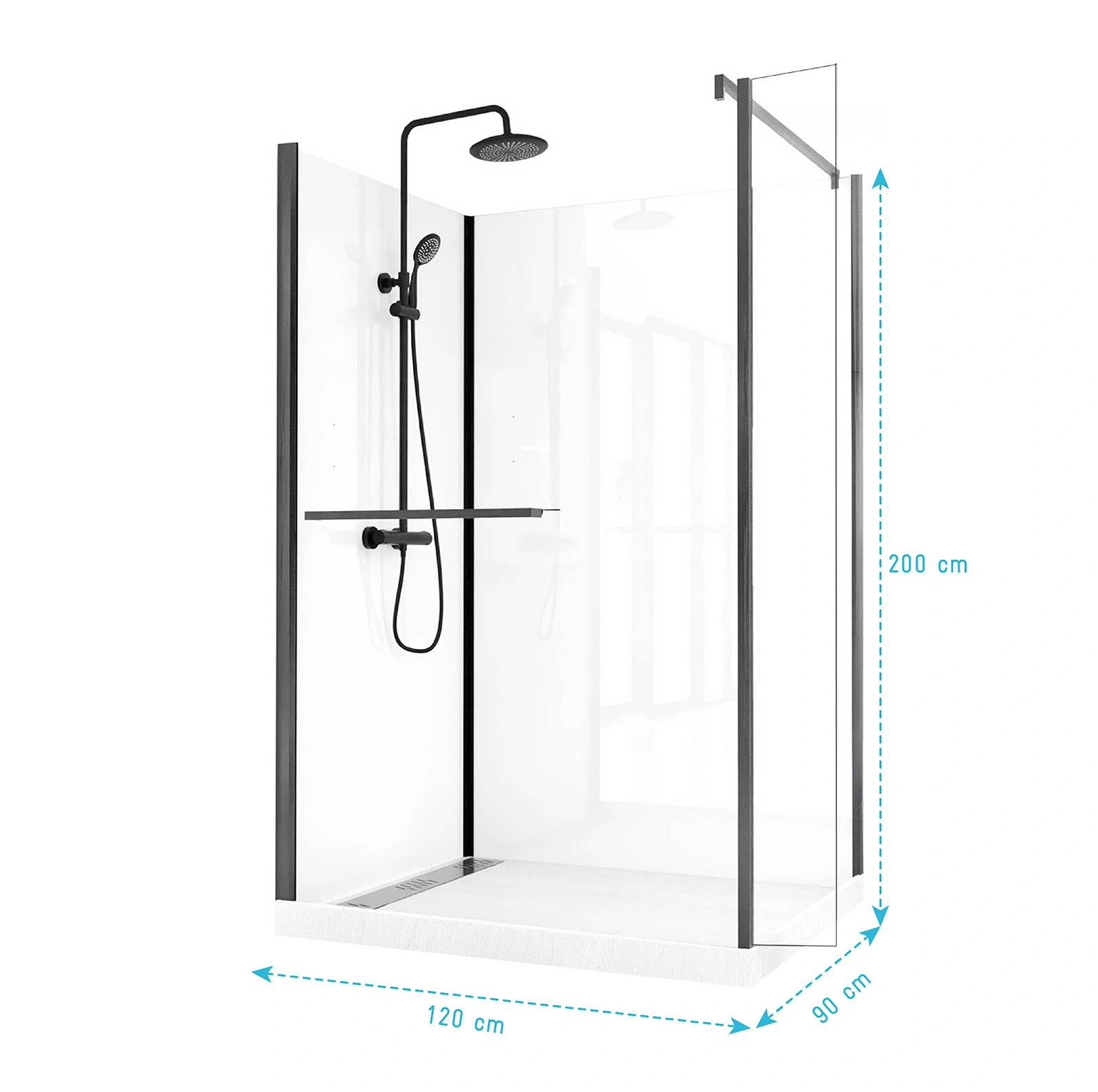 - Hauteur receveur + paroi : 197.5 cm