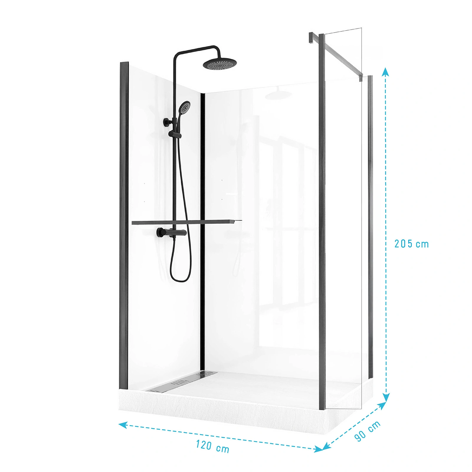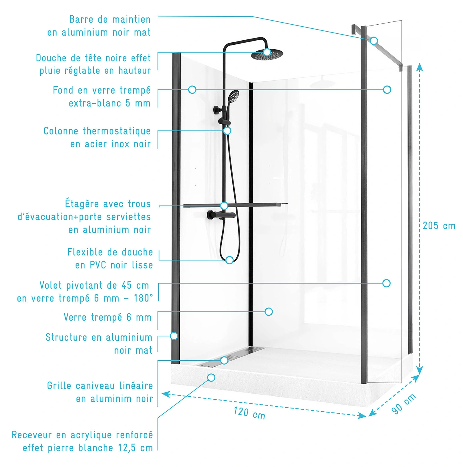 Cabine de Douche à l'Italienne 120x90 - Colonne Thermostatique Noire et Receveur Haut Effet Pierre