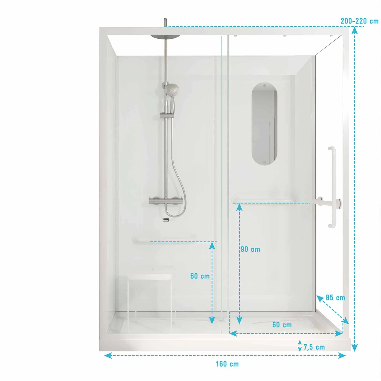 Cabine de douche blanche sécurisée et accessible à tous 160x85x220cm – Mitigeur Thermostatique