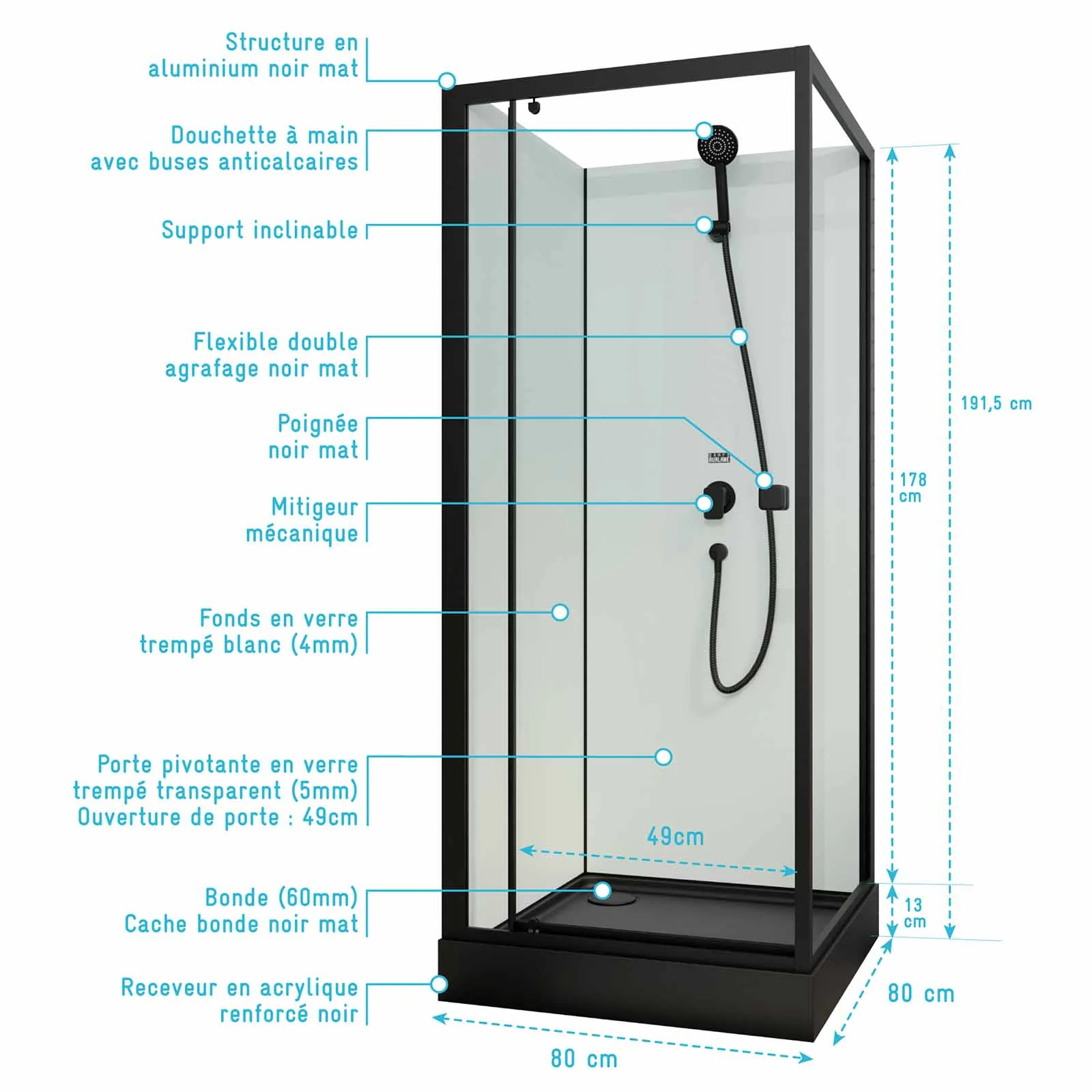 Cabine de douche carrée 80x80x200cm – Porte pivotante – Fonds Blancs – Receveur et Profilés Noirs