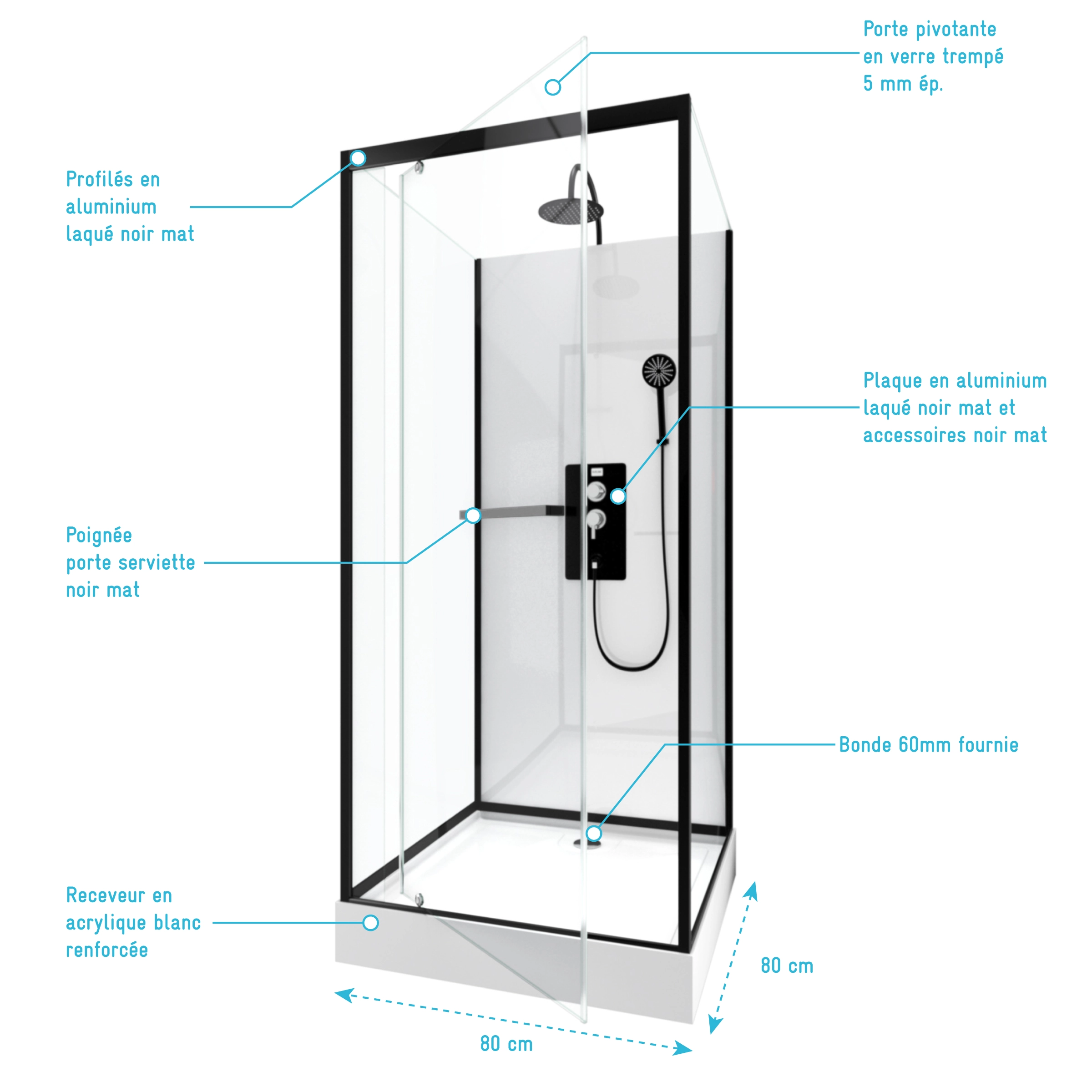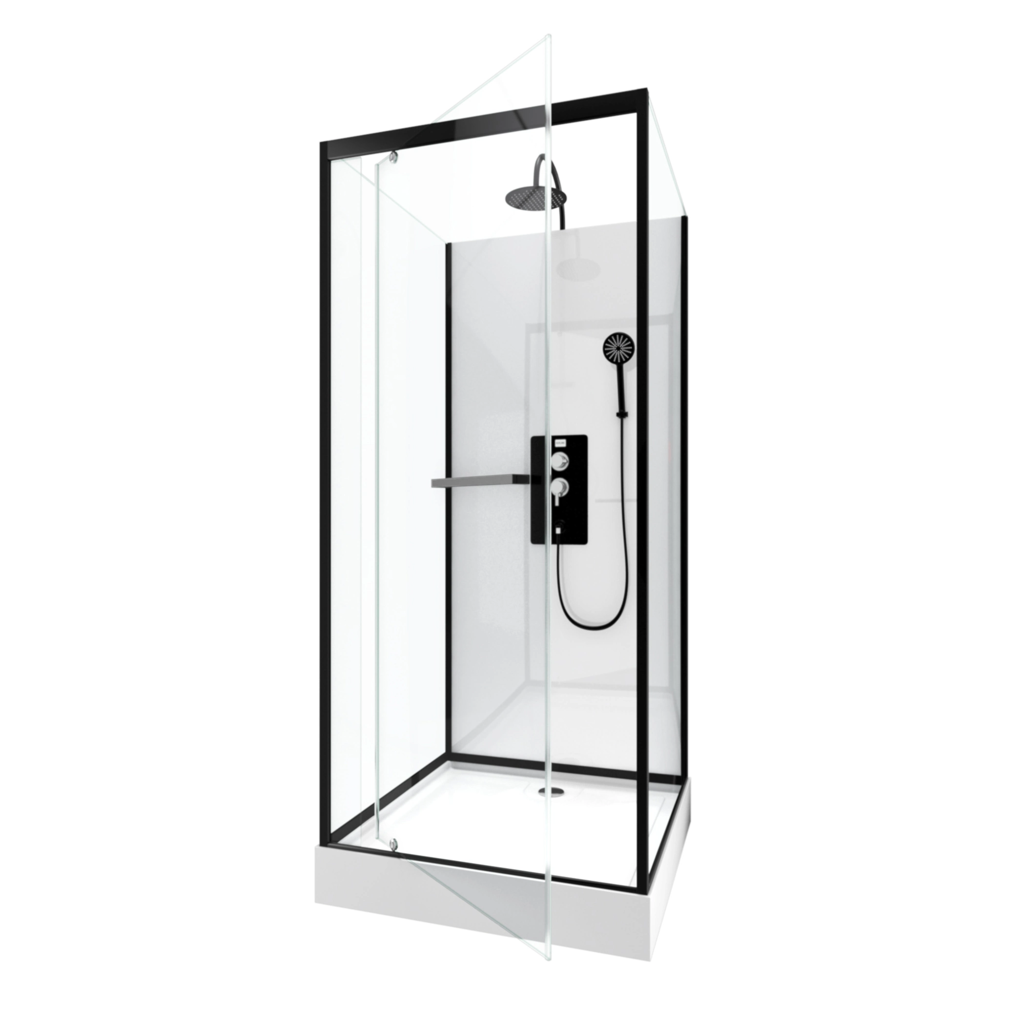 0 avis ELEMENTARY Cabine de douche carrée 80x80x200cm - Porte pivotante - Fonds Blancs - Receveur et Profilés Noirs