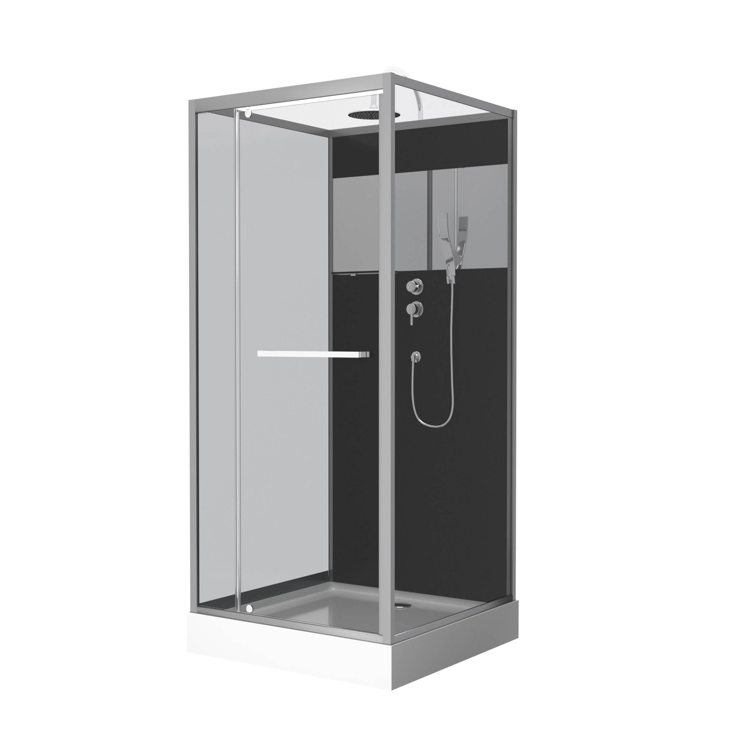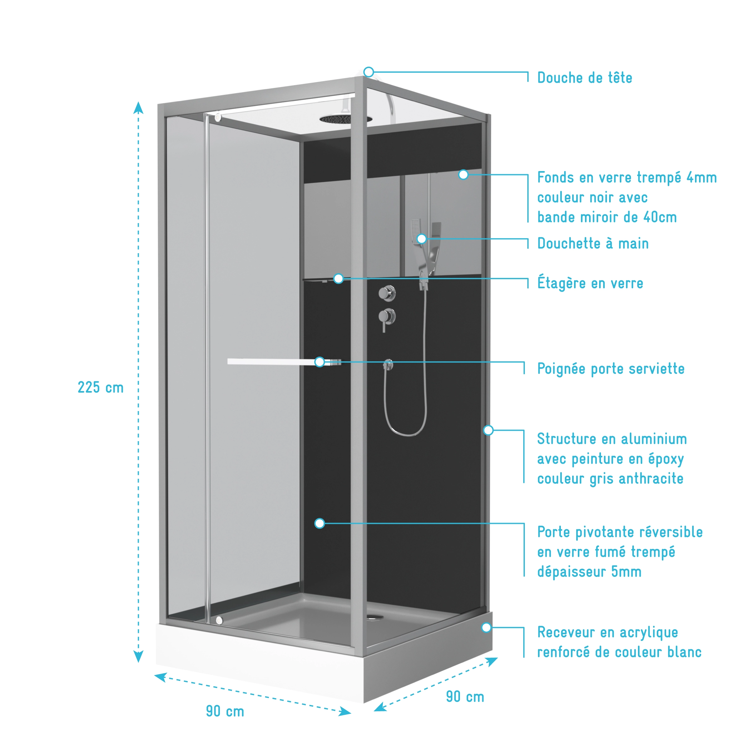 11 avis pour Cabine de Douche Carrée 90x90cm Porte Pivotante – Fond Noir avec bande effet miroir – SQUARE STRIPE