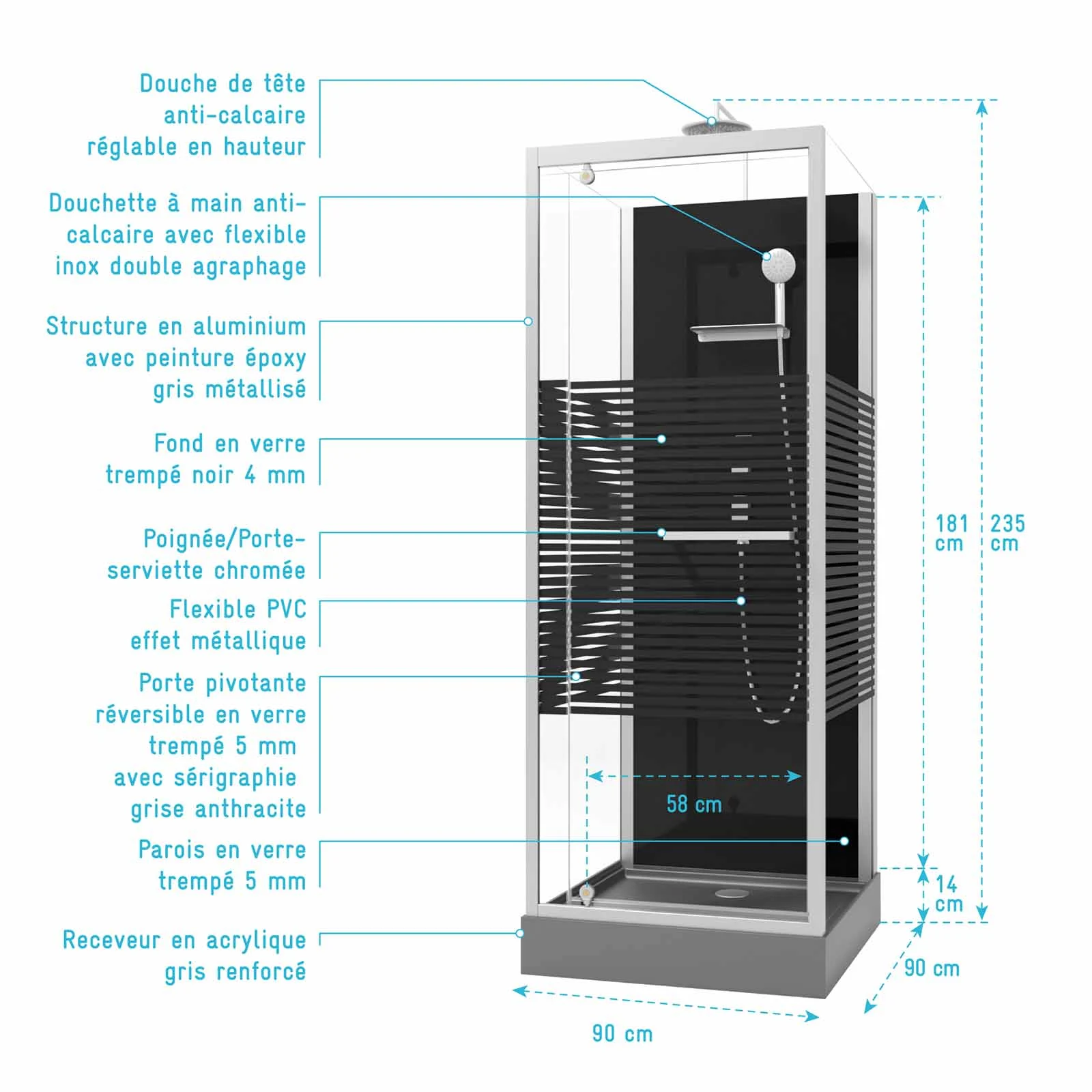 Cabine de douche carree 90x90x215cm – Porte pivotante – Lignes grises anthracites – SCRATCHY 2