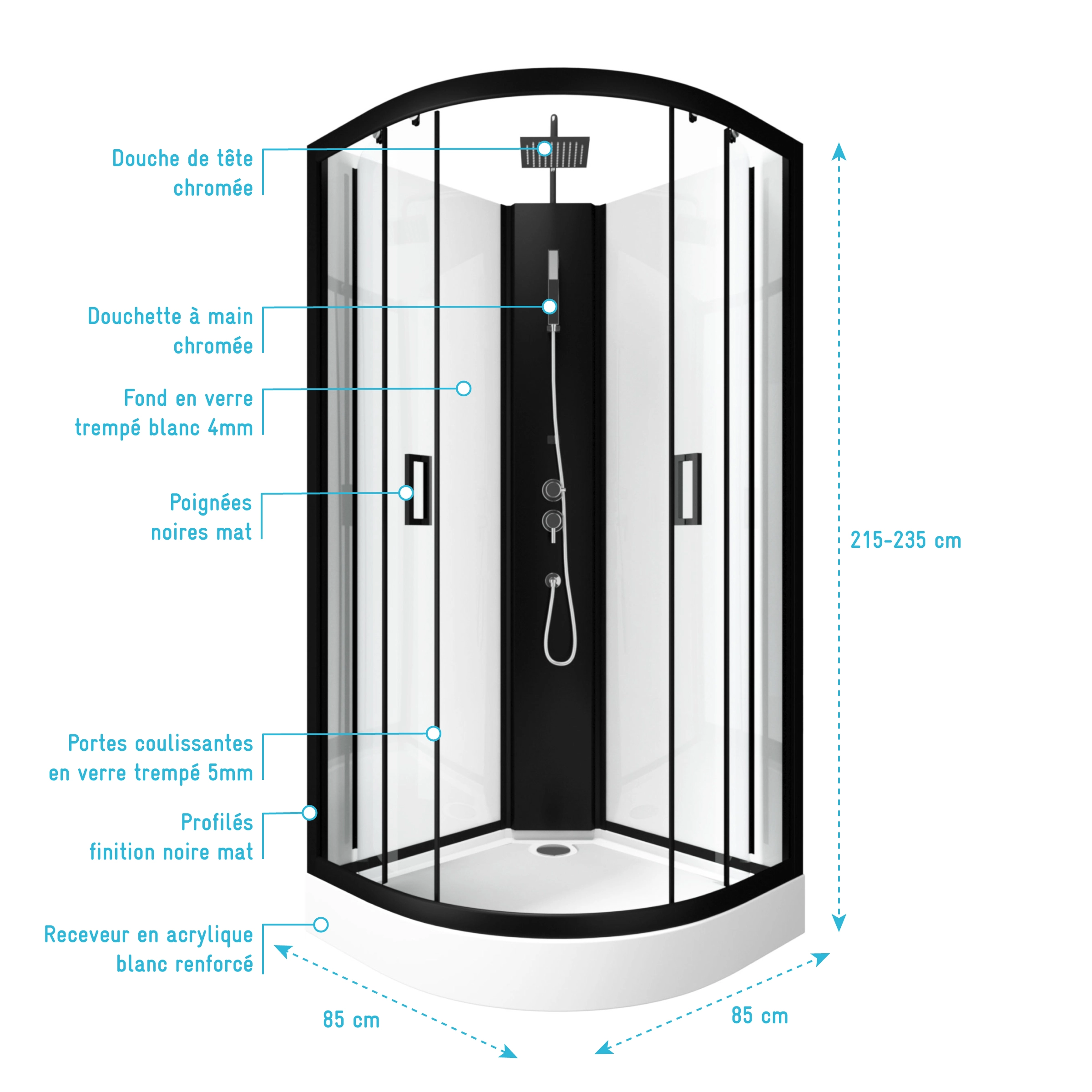 Cabine de douche 1/4 de cercle 85x85x210/235 cm - Receveur + Fonds Blancs / Colonne + Profilés Noirs