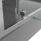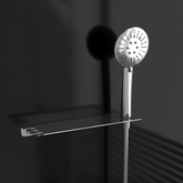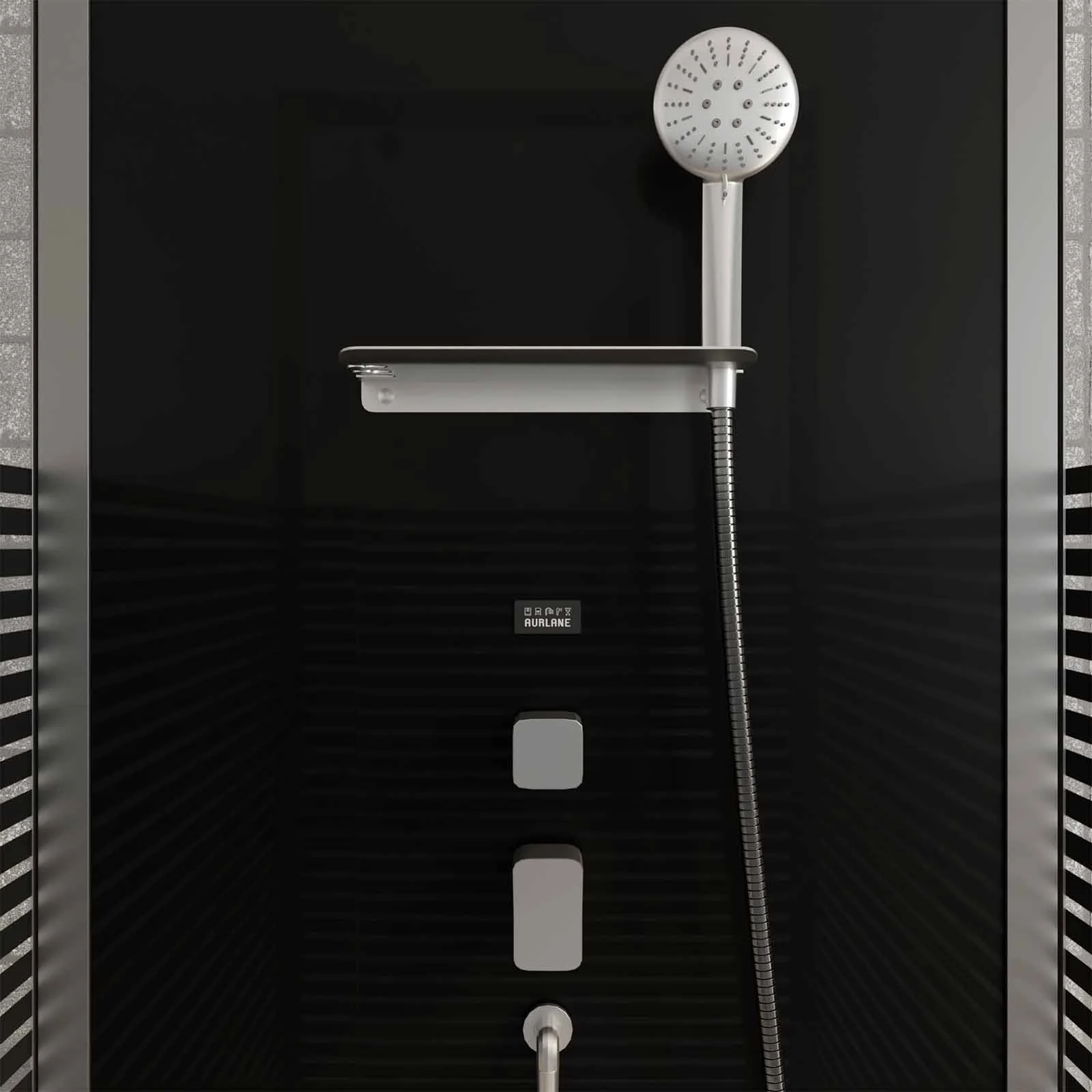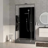 Le receveur gris apporte du contraste, pour un espace moderne et équilibré. Pensée pour le confort du quotidien, la cabine intègre une poignée qui fait office de porte-serviette et également une étagère support douchette.