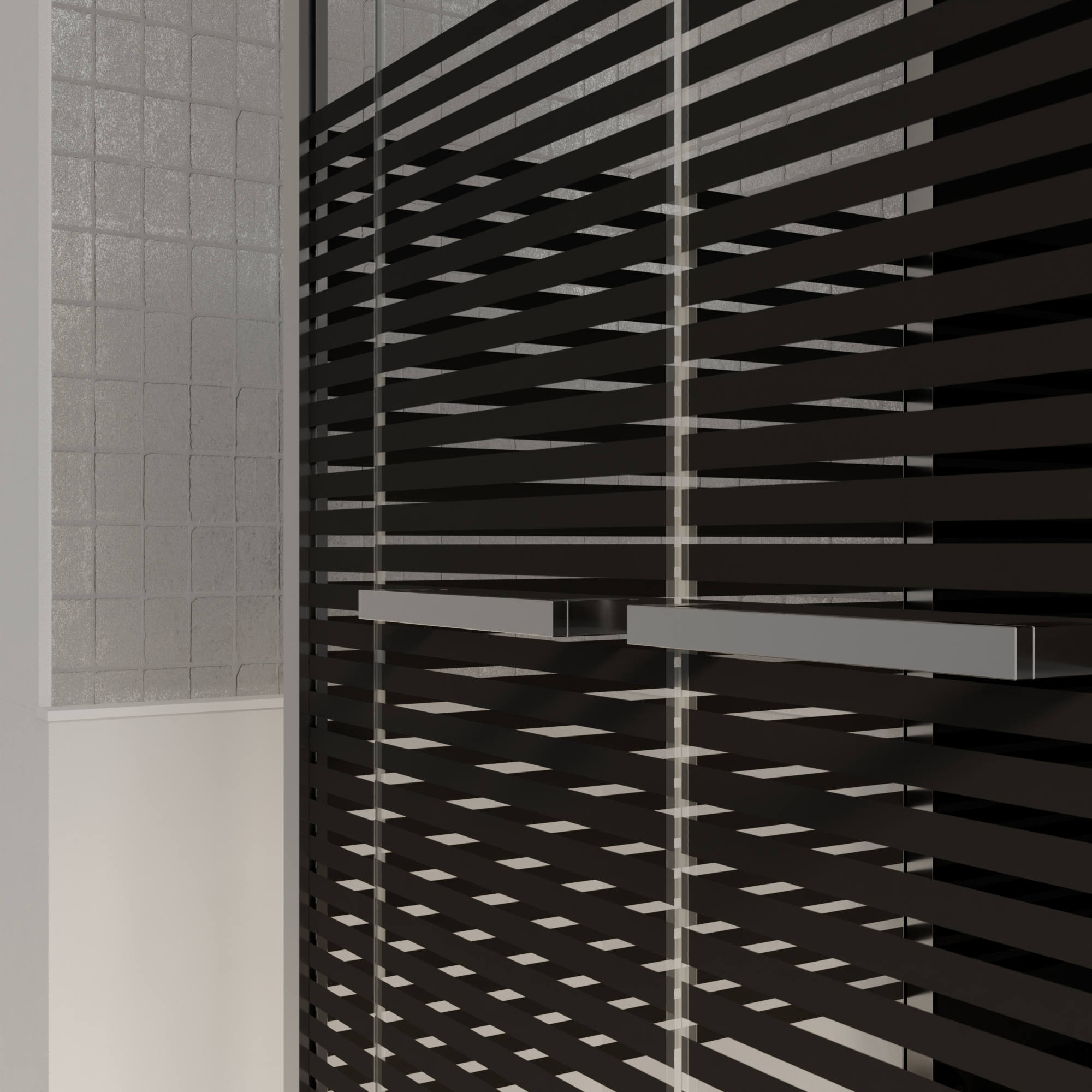 - Portes pivotantes en verre trempé (5mm) avec lignes sérigraphiées grises anthracites