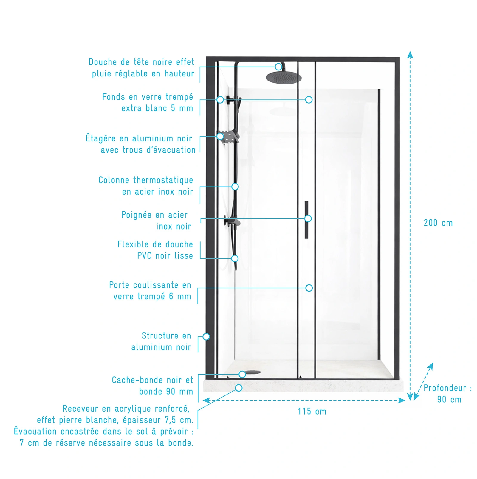 Cabine de Douche Rectangle 115x90 - Colonne Thermostatique Noire et Receveur Haut Effet Pierre