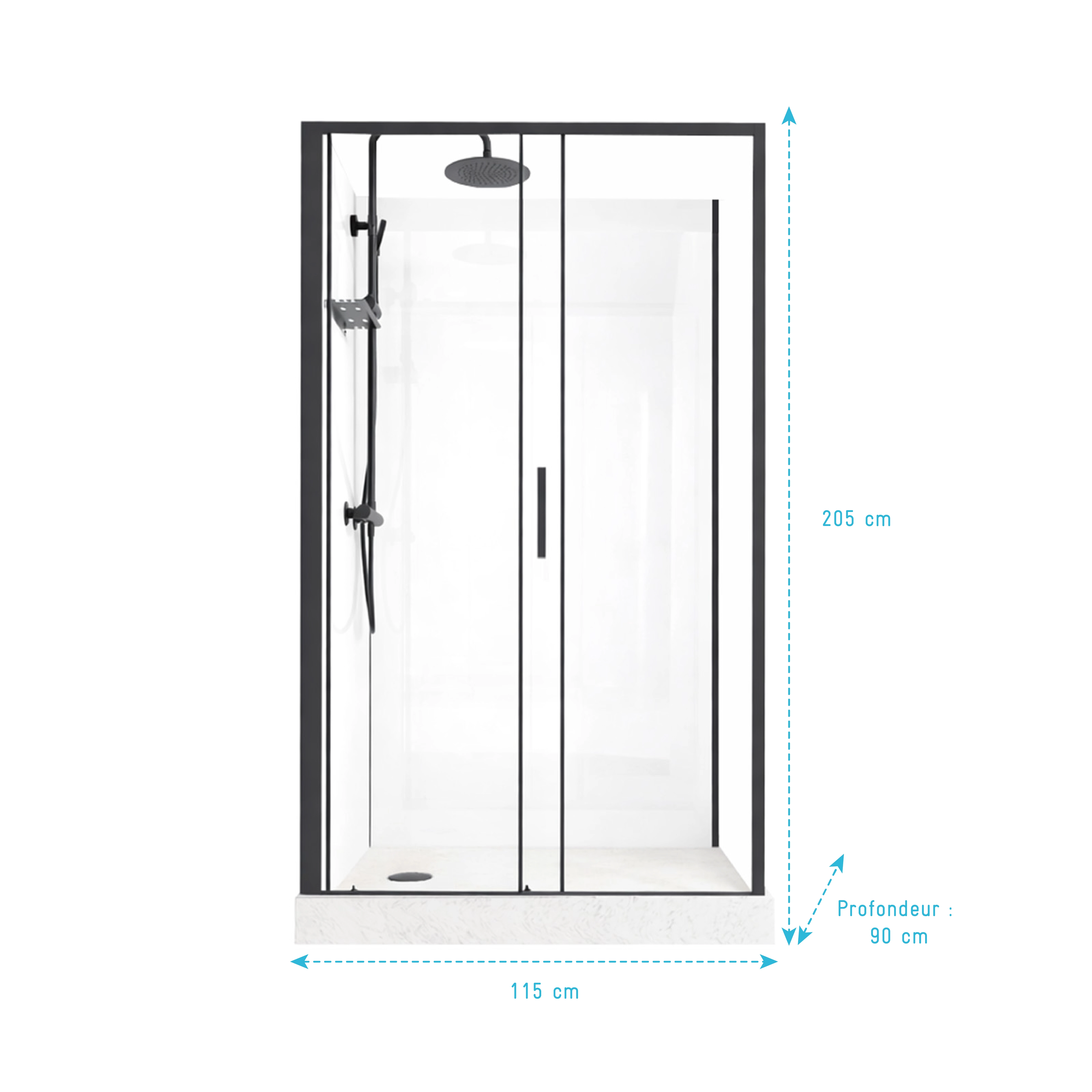 - Hauteur receveur + paroi : 202.5 cm