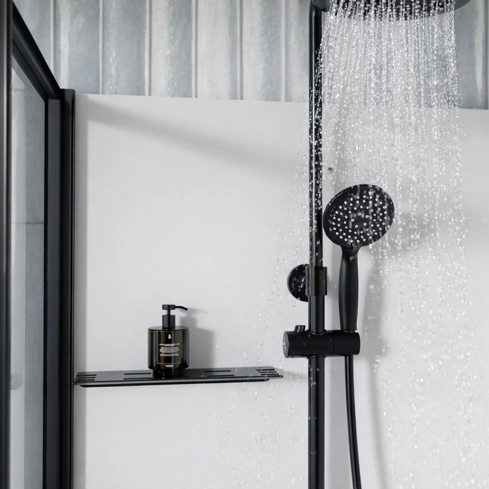 - Colonne de douche thermostatique en acier inox noir mat avec support de douchette inclinable et douche de tête réglable en hauteur