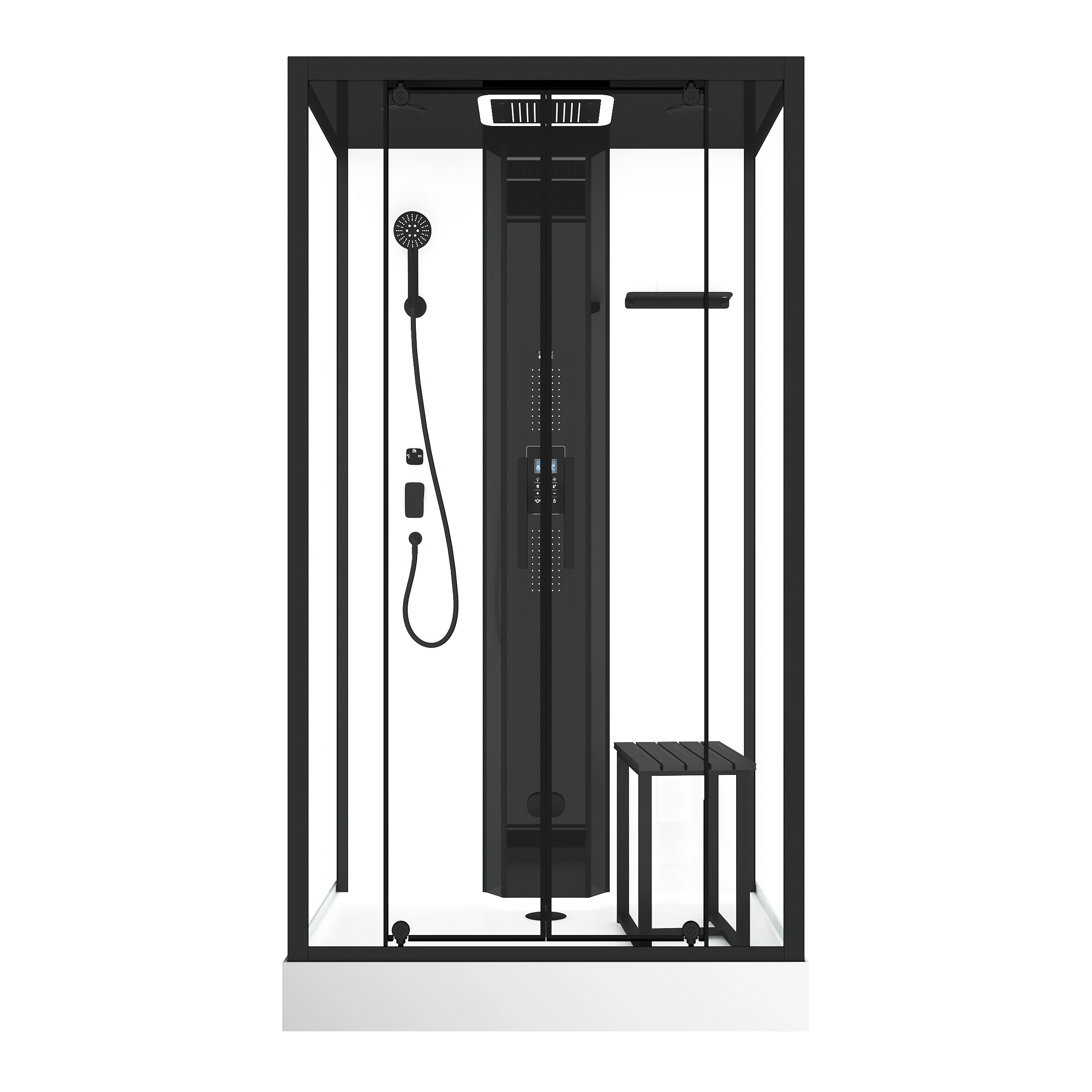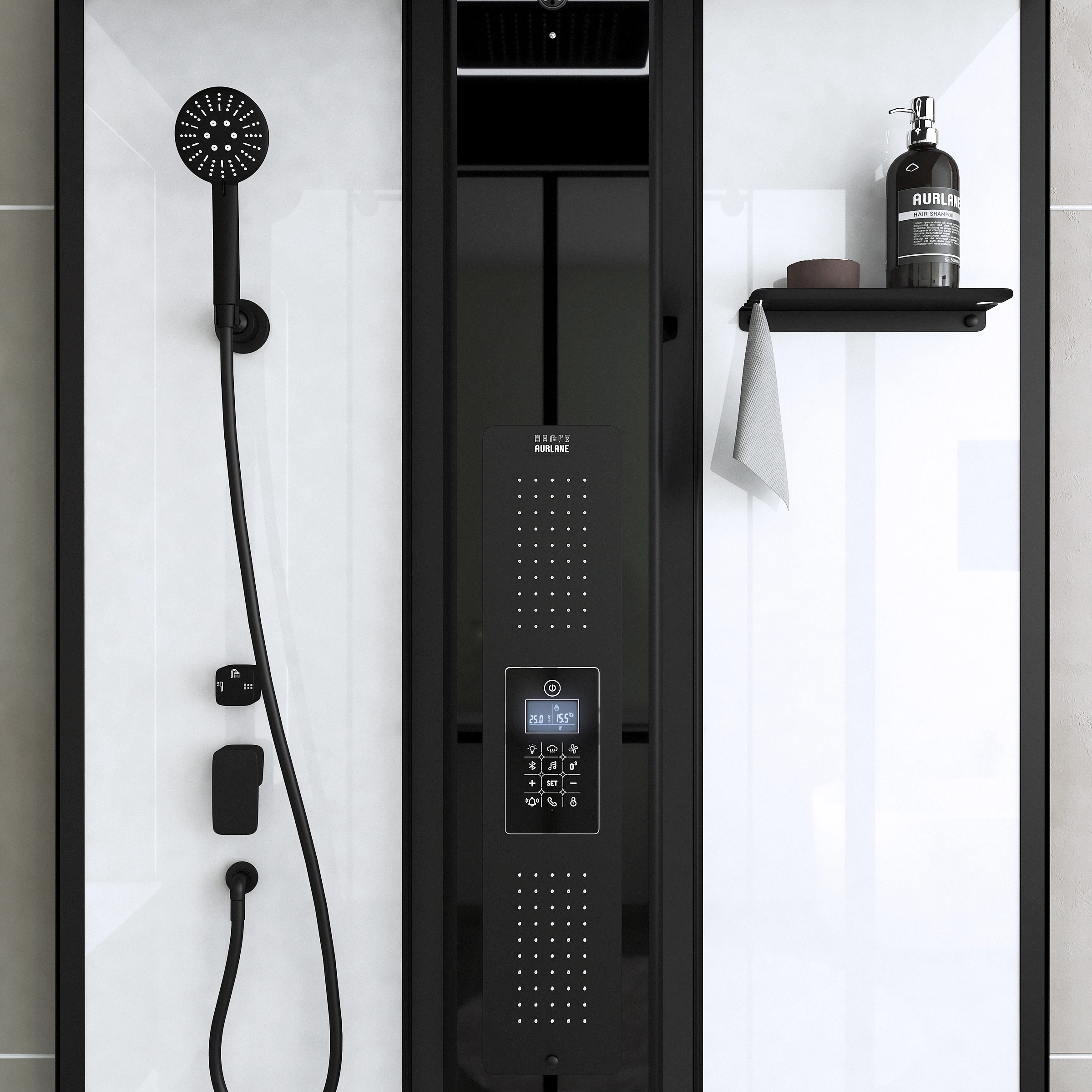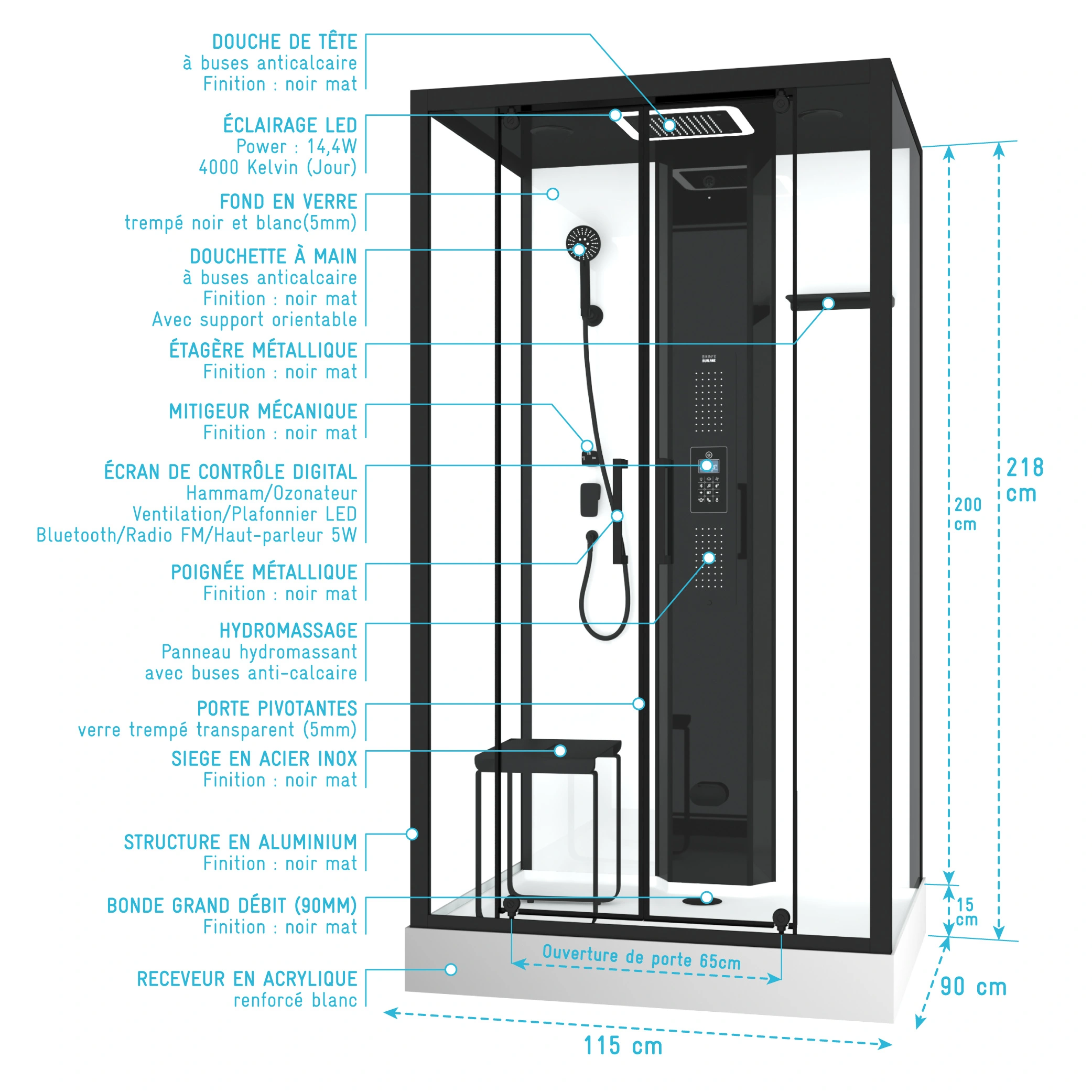 Découvrez les diverses fonctions pour se décontracter : hydromassage, douche pluie, douchette, musique, lumière, hammam.