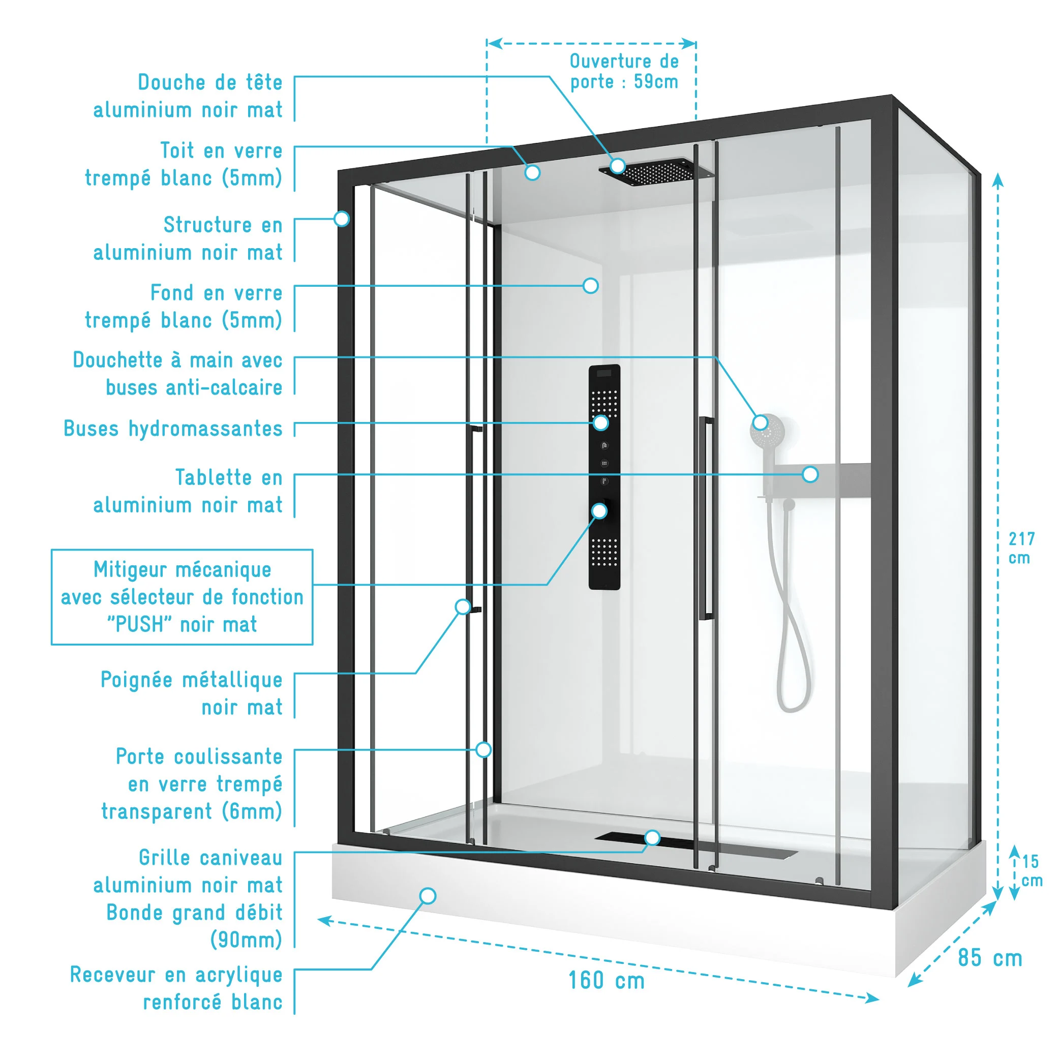 Avec sa structure noir mat, la cabine FACTORY 2 XXL apportera un style très industriel et tendance à votre salle de bain. En passant de l’étagère aux poignées, le noir mat est omniprésent et saura parfaitement s’accorder avec votre intérieur.