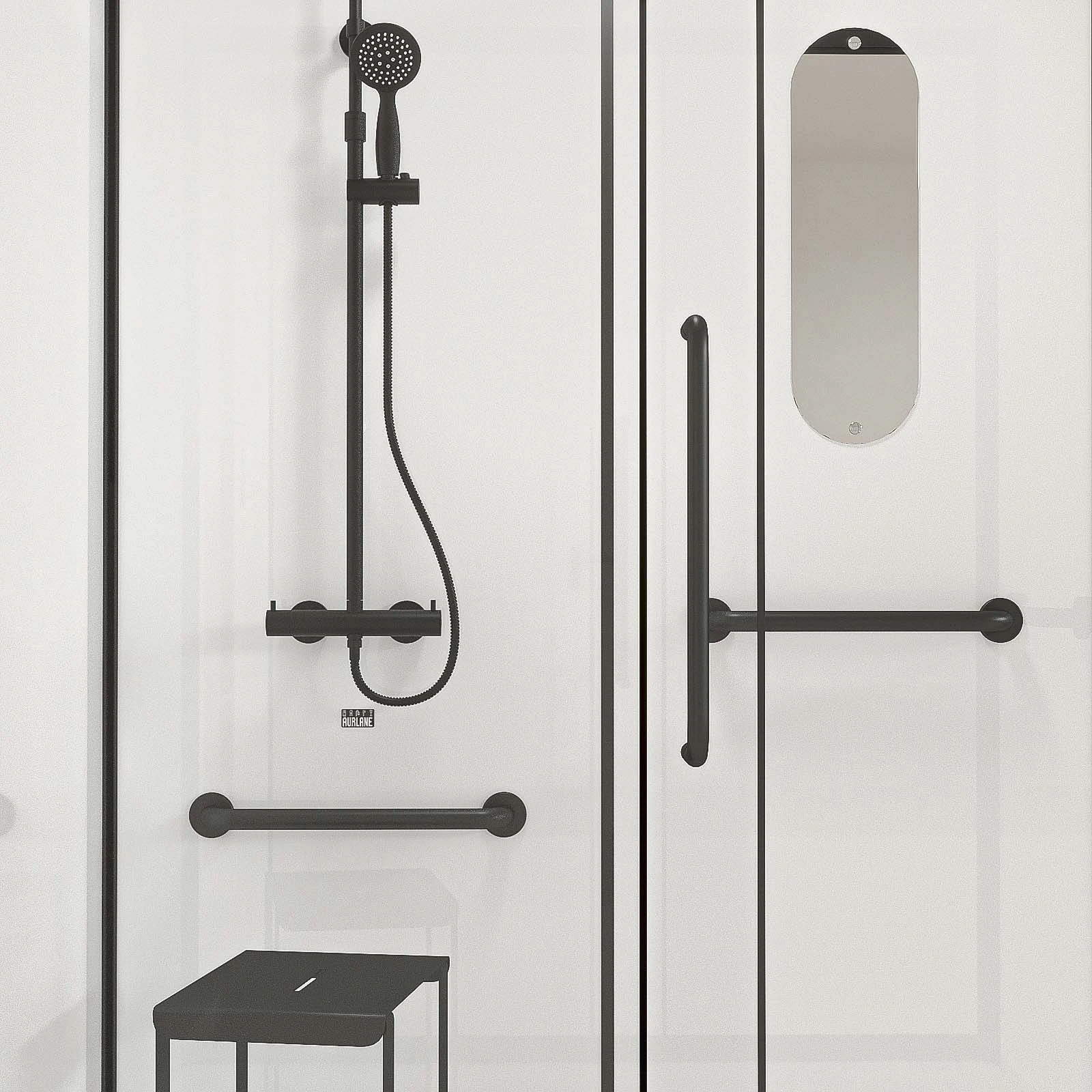 La sécurité est assurée par les 1 barre de relevage et 2 barres de maintien présentes dans la cabine de douche. L’acier laqué noir mat assure une prise en main efficace et agréable. La barre de relevage est un équipement indispensable pour assurer l’autonomie et constitue une solution anti-chutes.