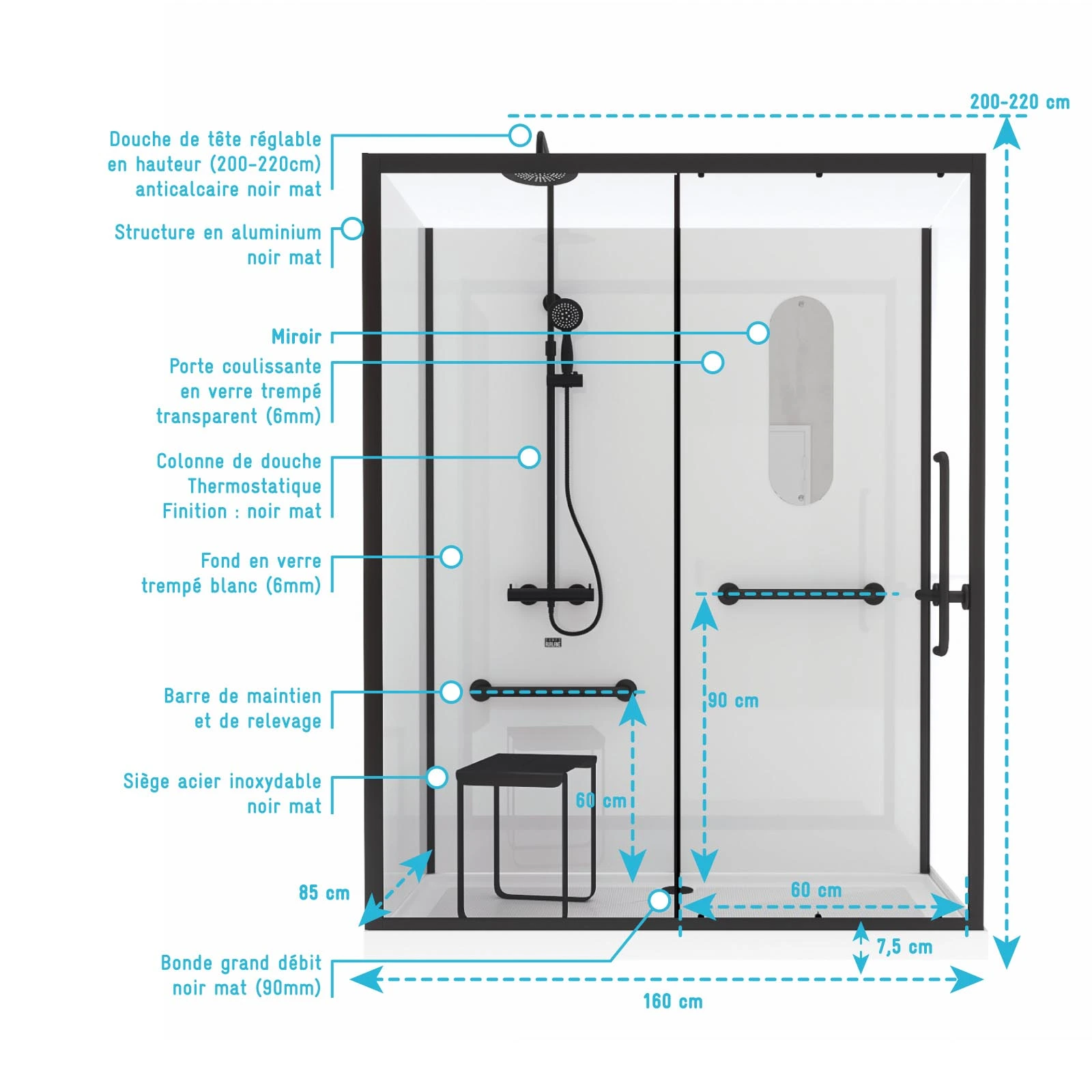 Cabine de douche Sécurisée et Accessible à Tous 160x85x220cm – Mitigeur Thermostatique