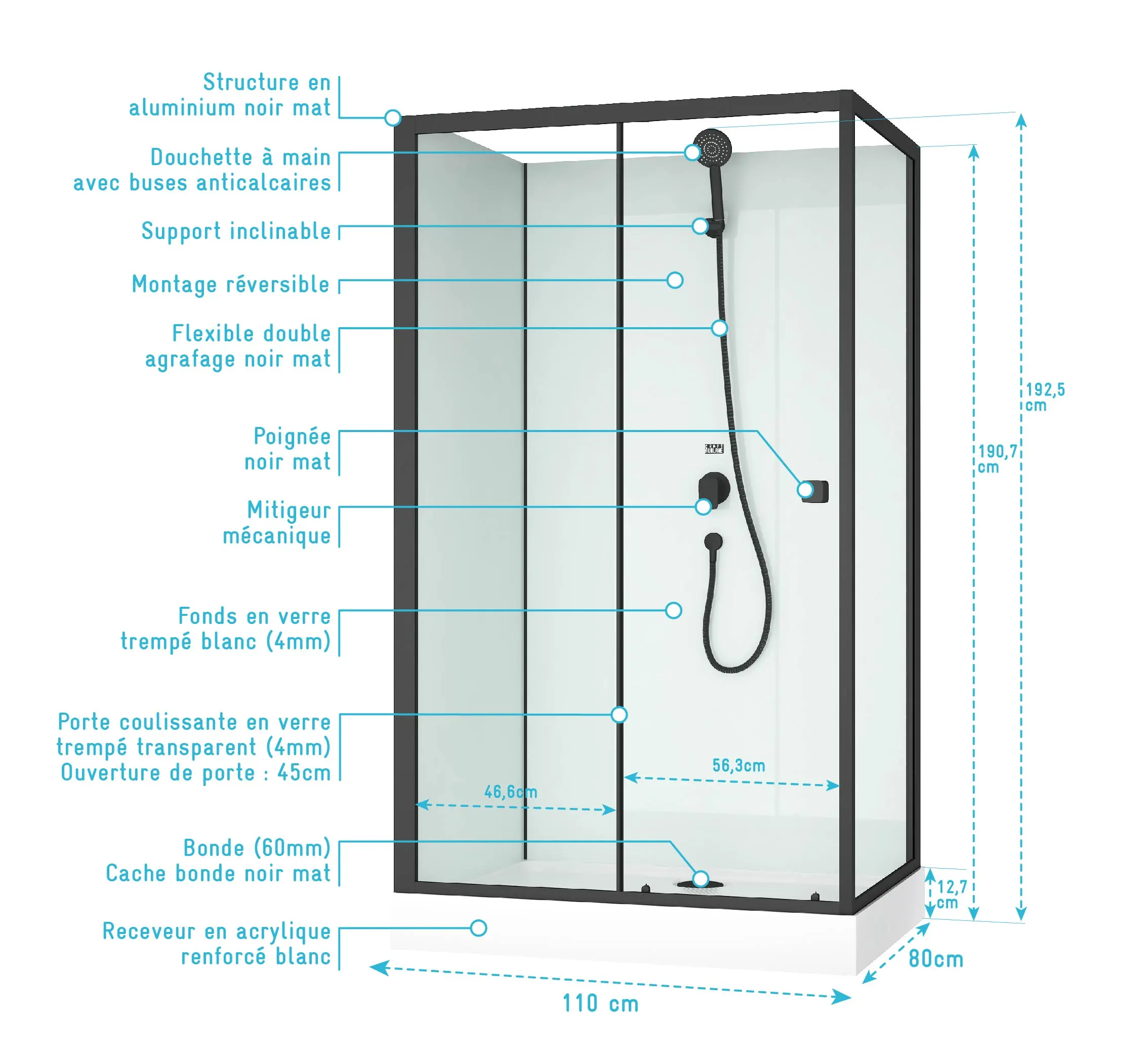 7 avis pour Cabine de douche rectangulaire 110x80x197 cm – Porte coulissante – Fonds Blancs & Profilés Noir Mat