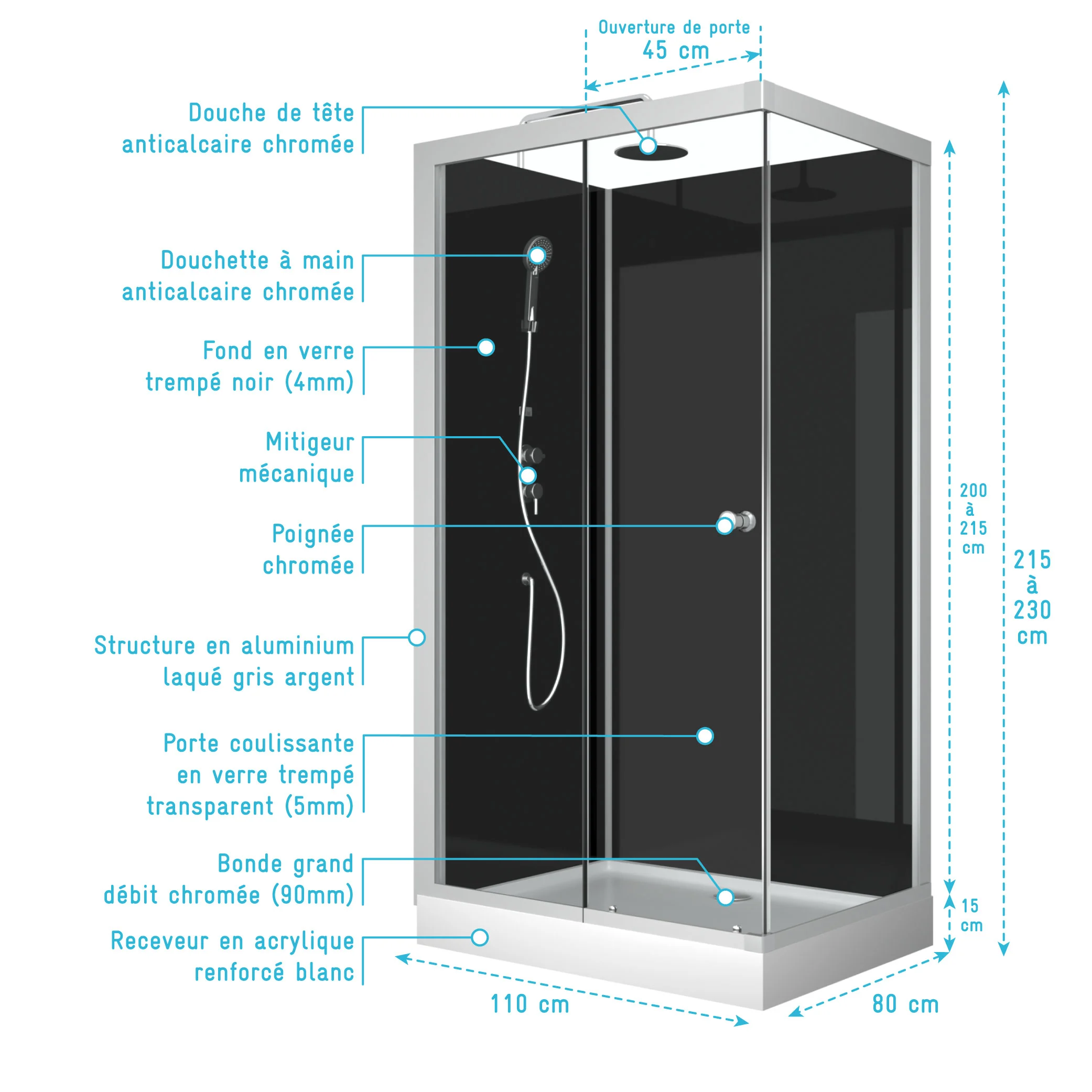 7 avis ELEMENTARY Cabine de douche rectangulaire 110x80x197 cm - Porte coulissante - Fonds Blancs & Profilés Noir Mat