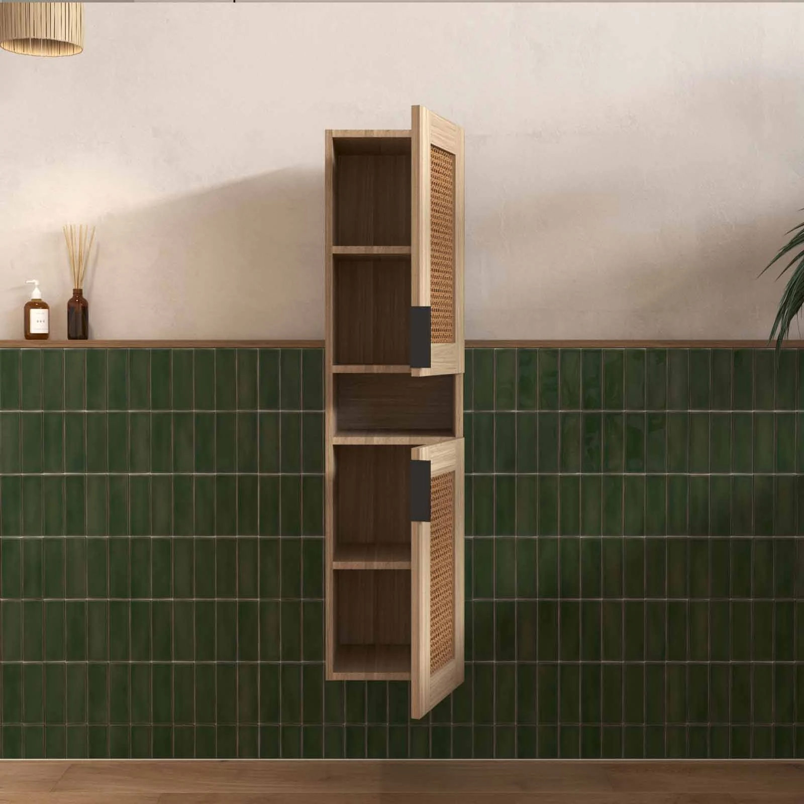 La gamme de meuble APOLLINE, c’est la rencontre du bois chaleureux et du cannage délicat. Cette collection a été imaginée pour faire de vos meubles de salle de bain de véritables éléments déco à part entière. Inspirée des tendances naturelles, cette gamme insuffle une élégance légère et texturée à la pièce d’eau. Le cannage, subtilement ajouré, évoque les savoir-faire artisanaux. Cette colonne APOLLINE transformera votre salle de bain en un espace de style.