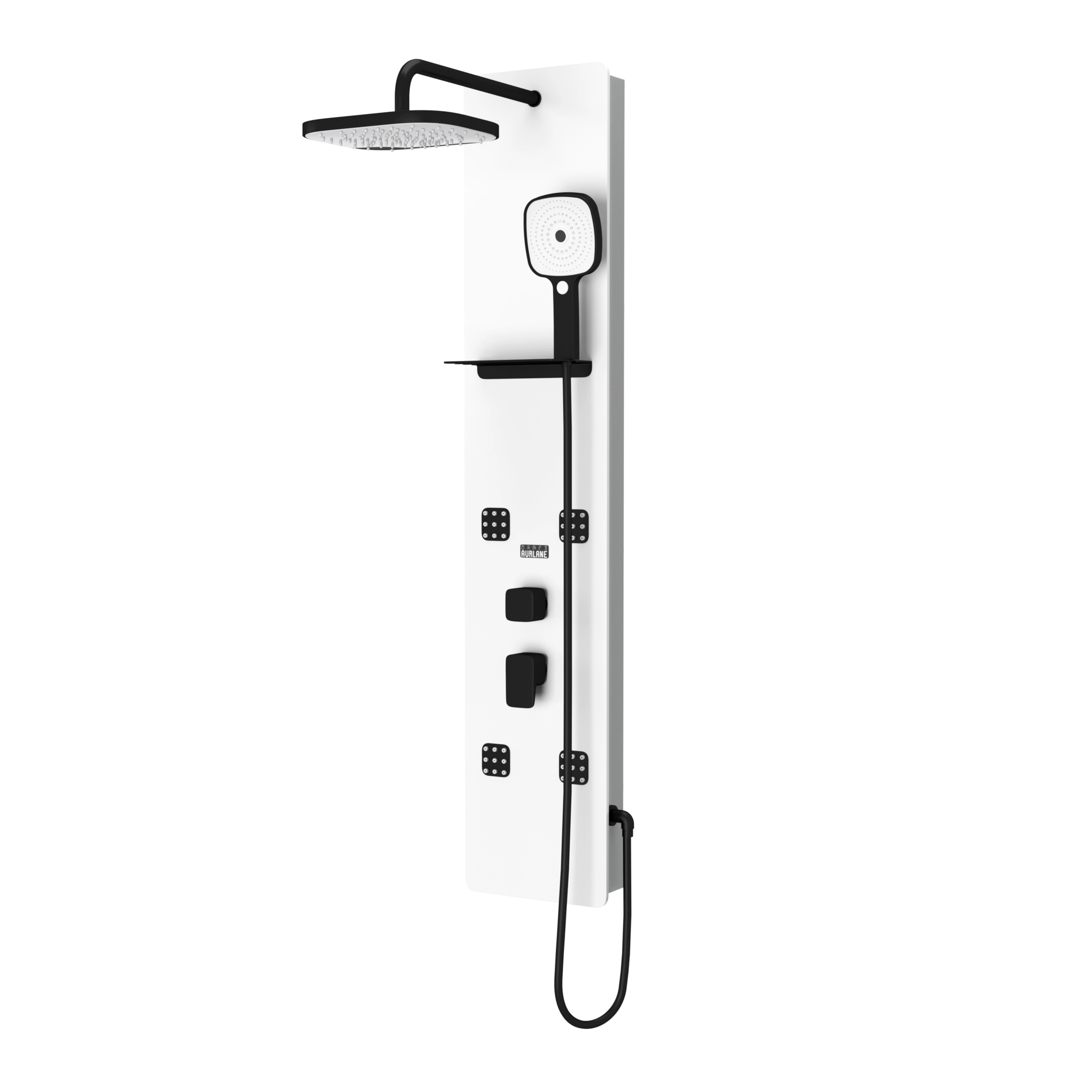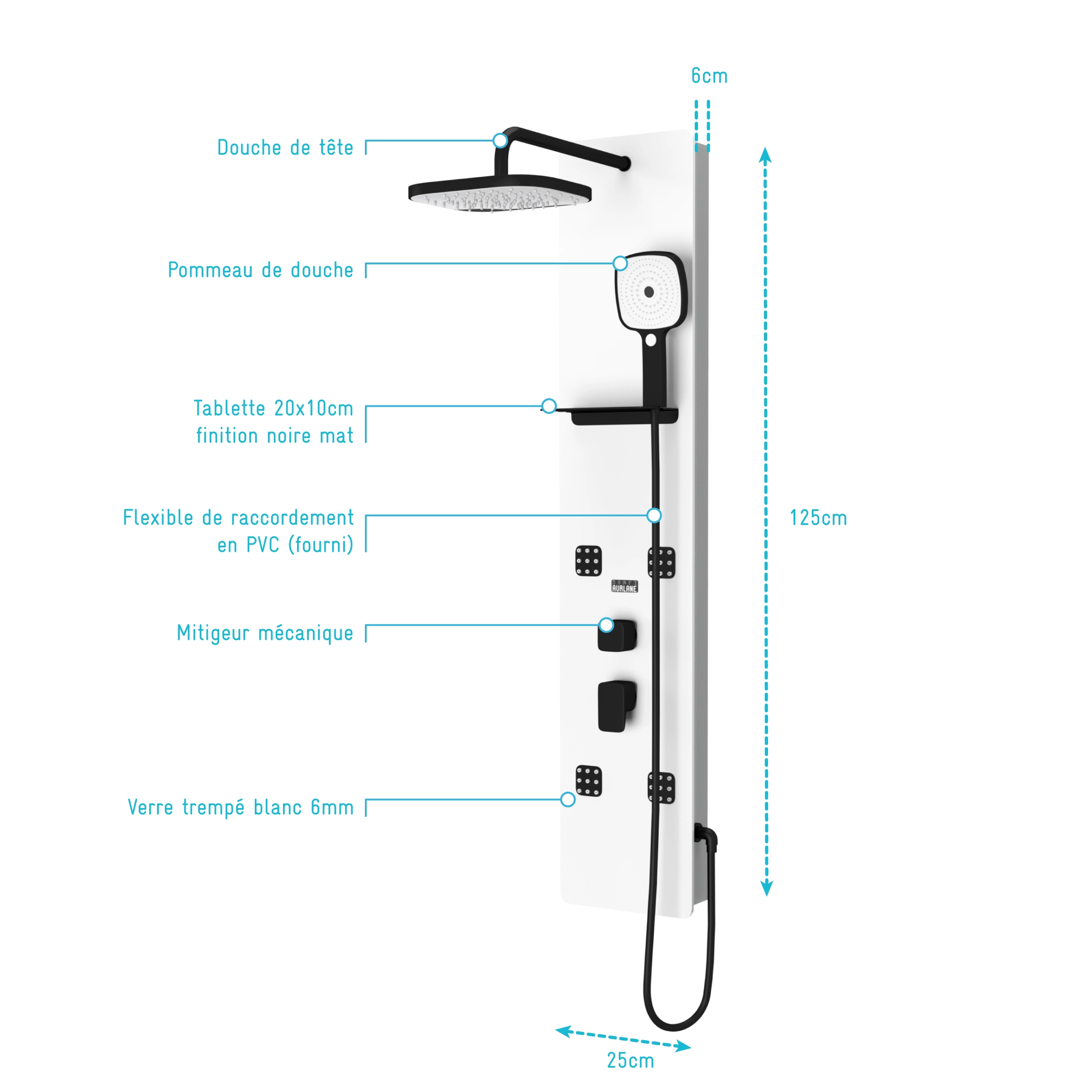 Equipée d’un fond en verre trempé blanc, la colonne dispose d’une grande largeur de tête, d’un pommeau de douche et de buses hydromassantes.