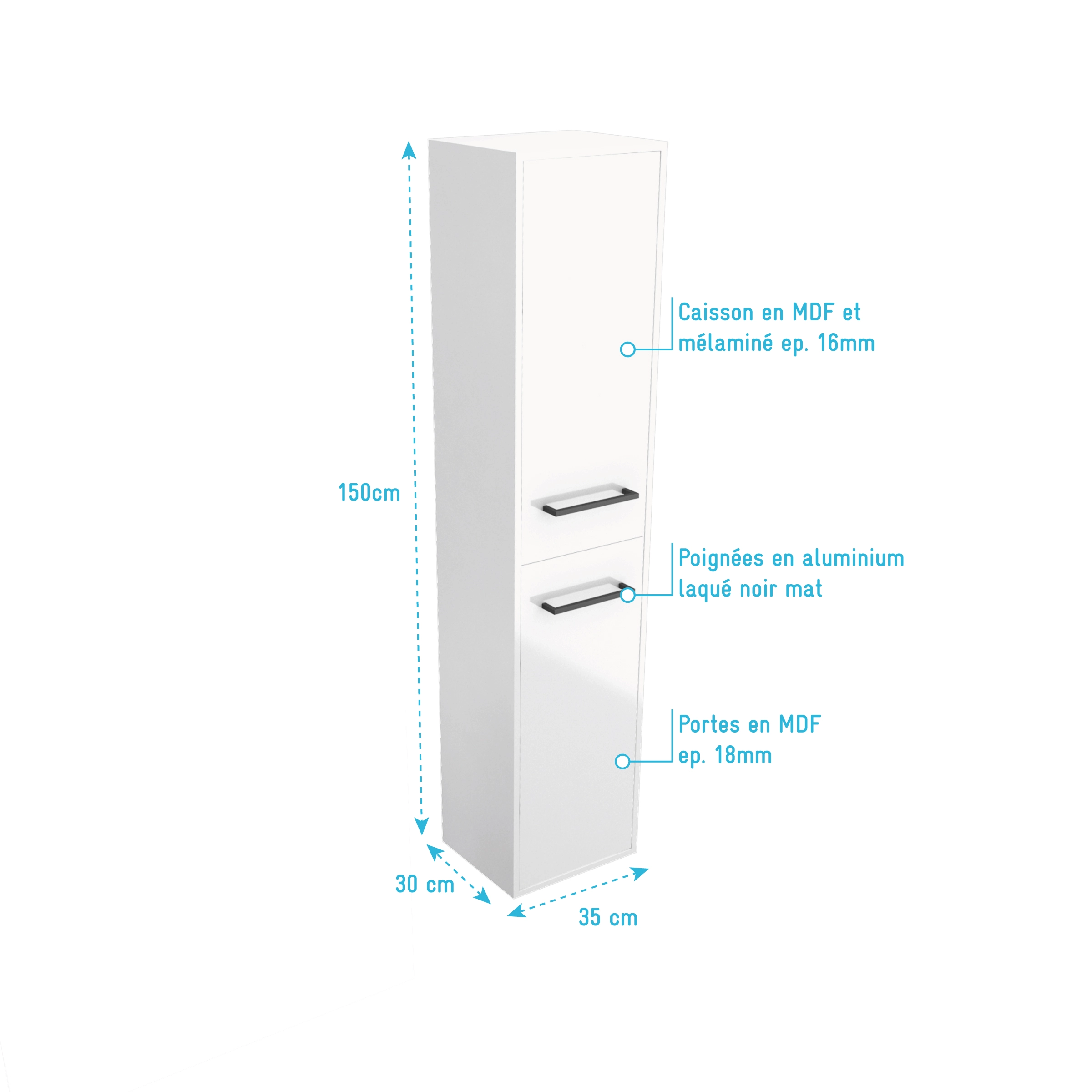 3 avis pour Colonne de salle de bain blanche 30x35x150 cm – 2 portes blanches poignees noir mat – STRUCTURA P015