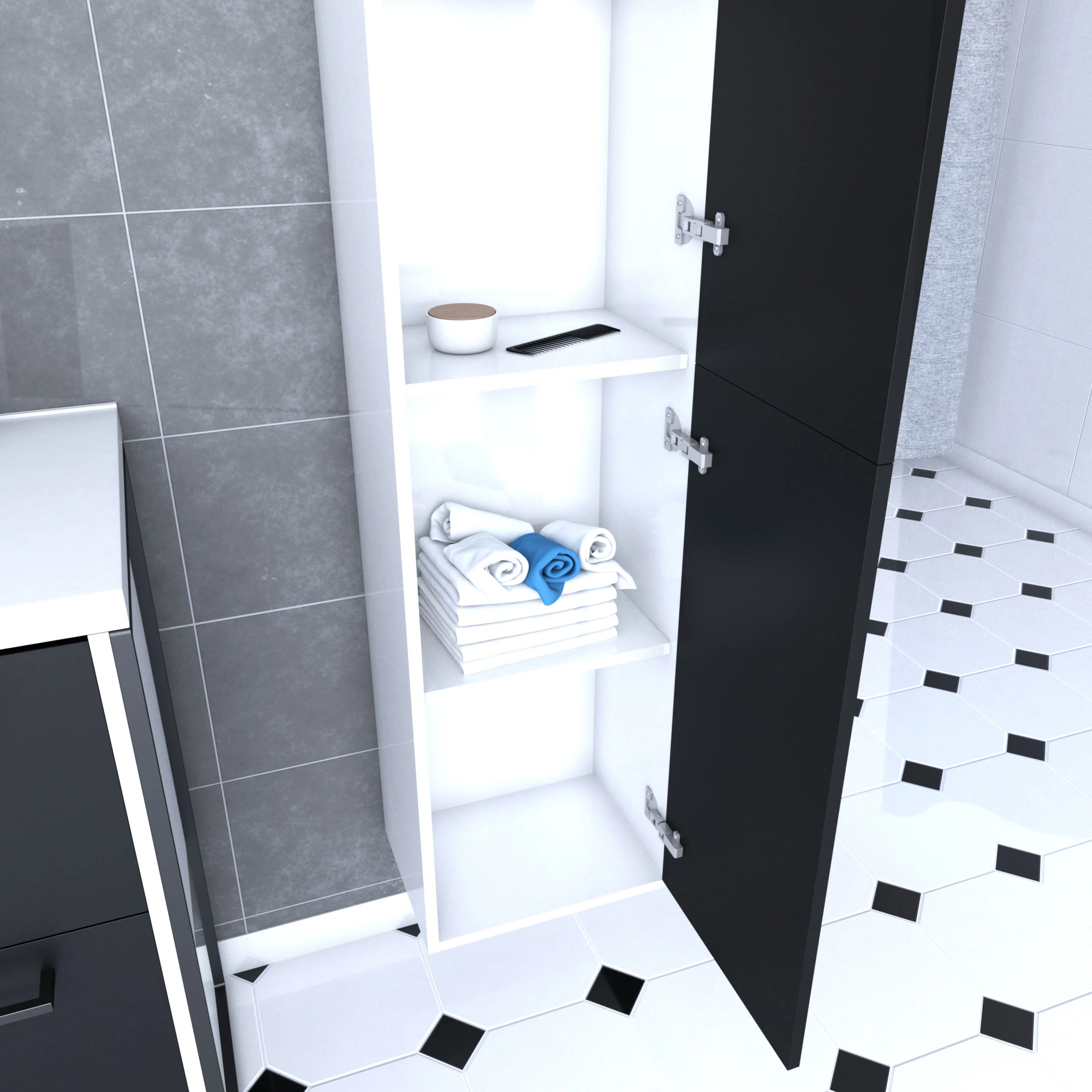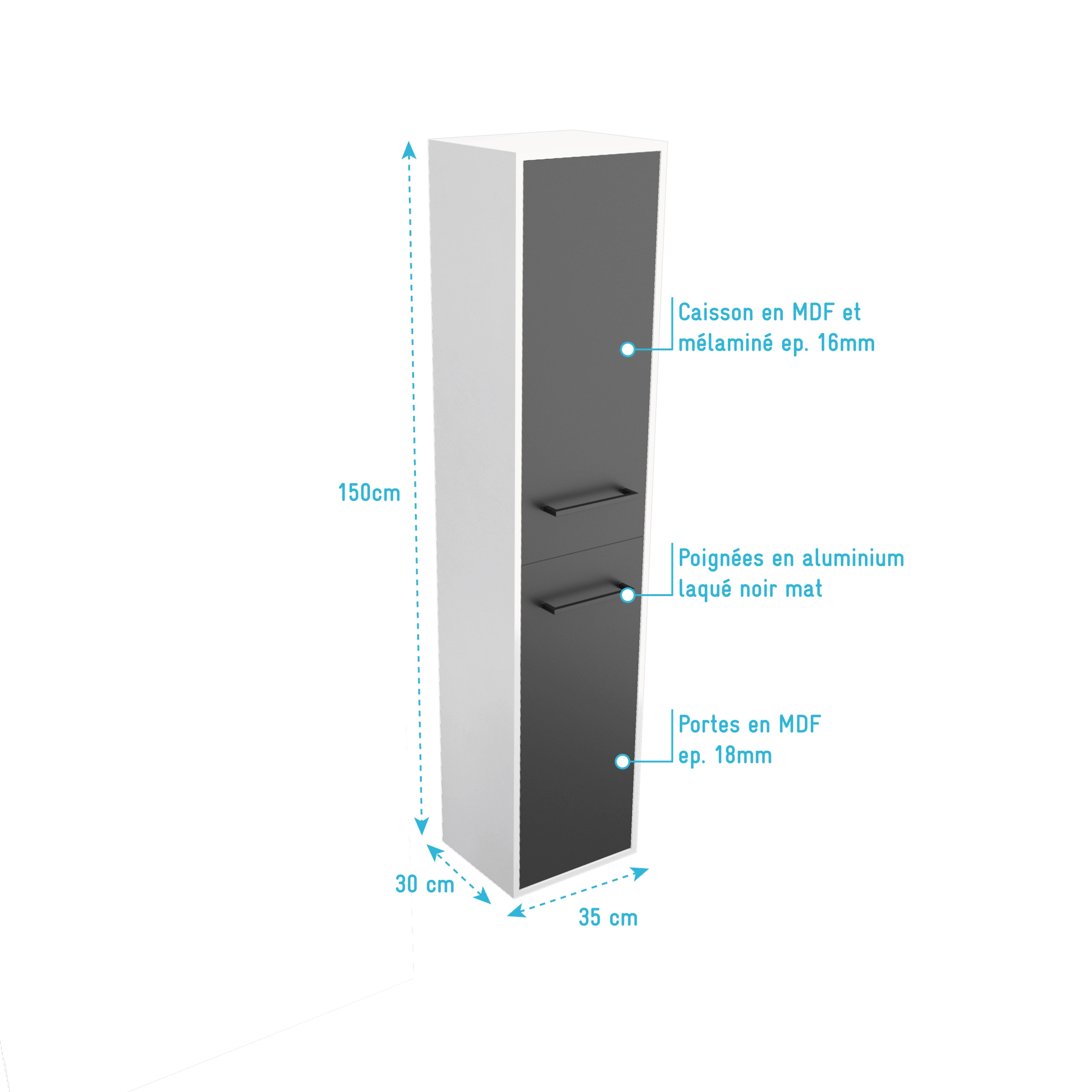 Colonne de salle de bain blanche 30x35x150 cm avec 2 portes et poignées noir mat – STRUCTURA P026