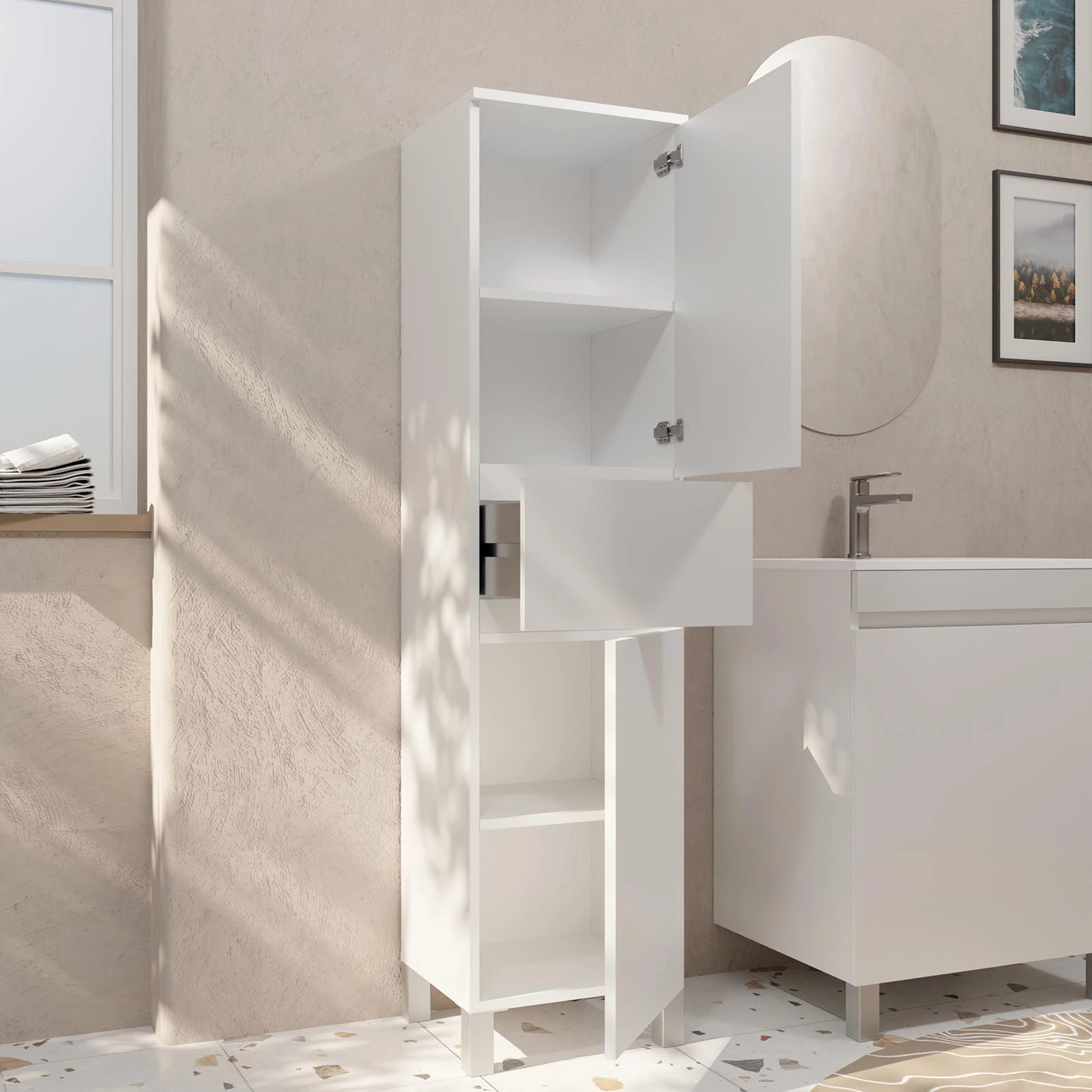Colonne de Salle de Bain en Mélaminé Blanc – 35x32x150 cm – 2 Portes + 1 Tiroir
