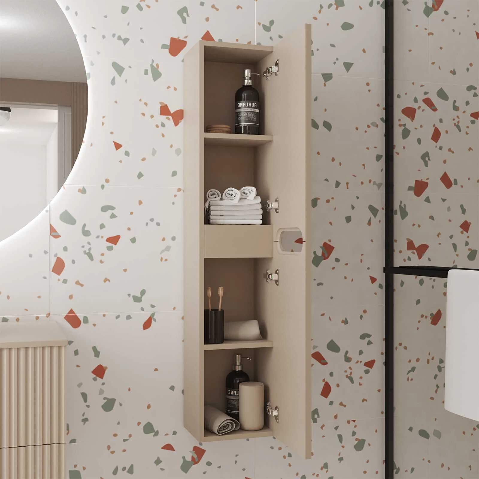 En plus d’être décorative, la colonne LEON offre un rangement pratique avec 4 compartiments spacieux derrière 2 portes ondulées. Idéal pour organiser produits de beauté, serviettes et autres essentiels, tout en conservant un style épuré et élégant.