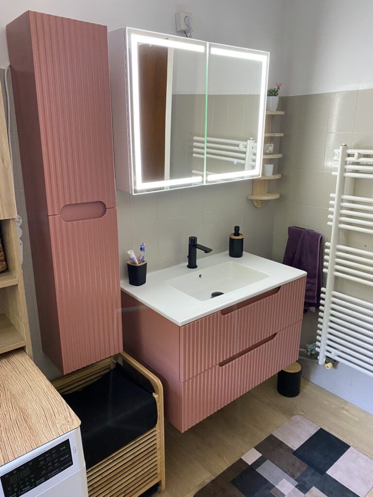 Je suis très heureux de mes nouveaux meubles de salle de bains, le terracotta a ajouté un vrai coup de peps à la pièce !