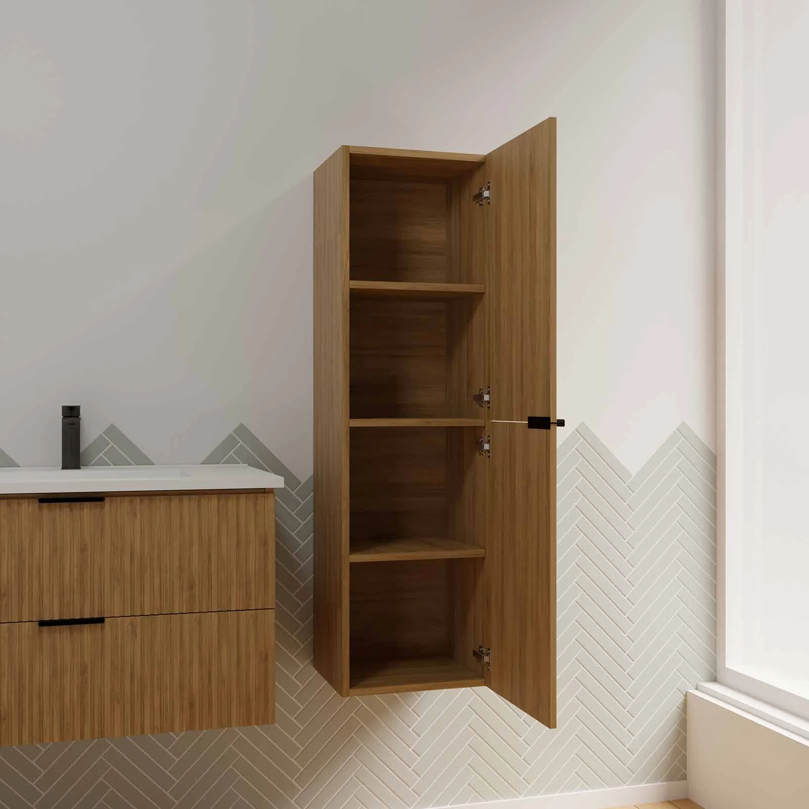 Avec ses façades de portes ondulées qui donnent du relief, ce meuble colonne transforme votre salle de bain en un véritable espace déco. La finition bois apporte une touche de chaleur à votre pièce d’eau. La colonne permet de ranger vos essentiels du quotidien. Le système de fermeture douce ‘soft-close’ assure un confort d’utilisation sans bruit.