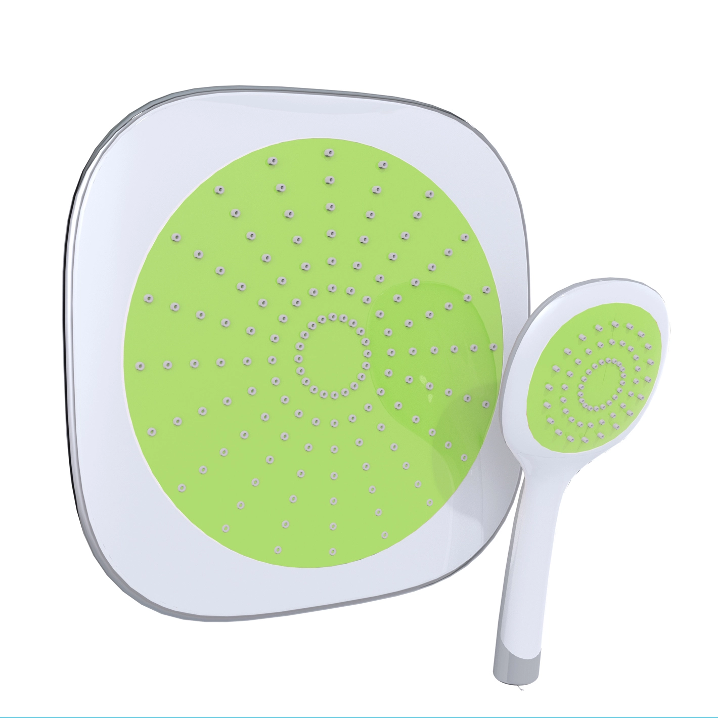 - Douche de tête carrée blanche et verte de 21.2 cm de coté avec picots anticalcaires