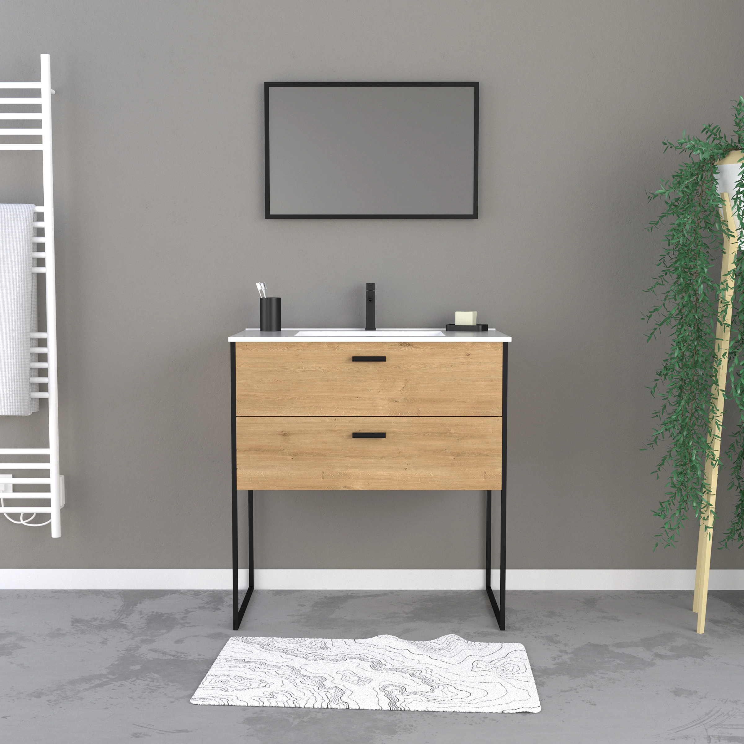 4 avis pour Ensemble meuble de salle de bain 80x45cm style industriel couleur chene naturel – vasque blanche