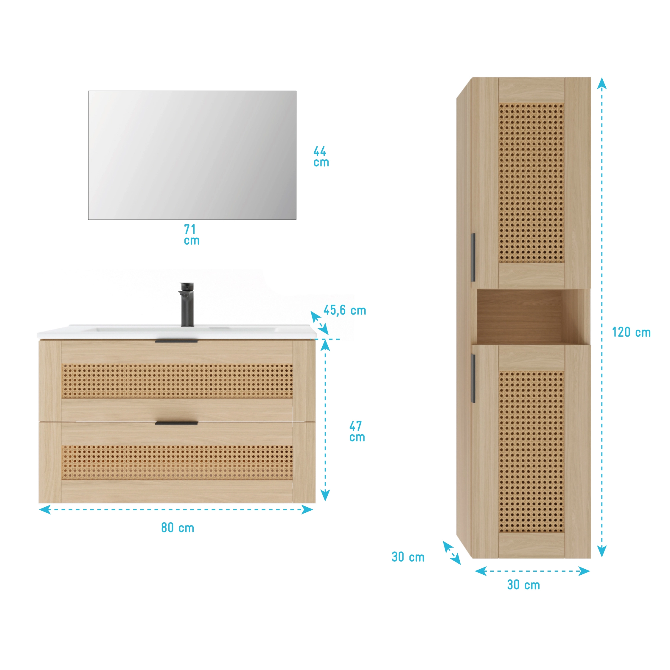 Ensemble Meuble de Salle de Bains 80 cm et Colonne – Decor Bois et Cannage – APOLLINE
