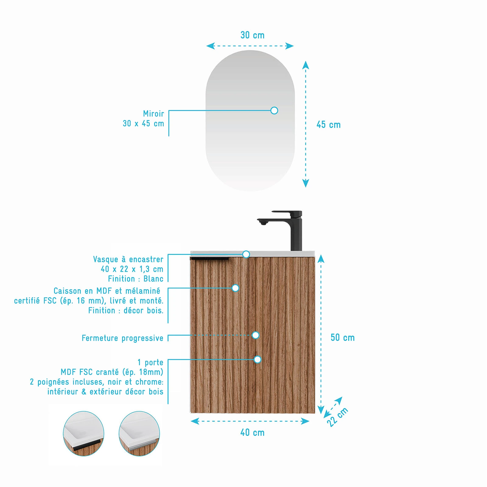 - Vasque : 40cm x 1.3cm x 22cm