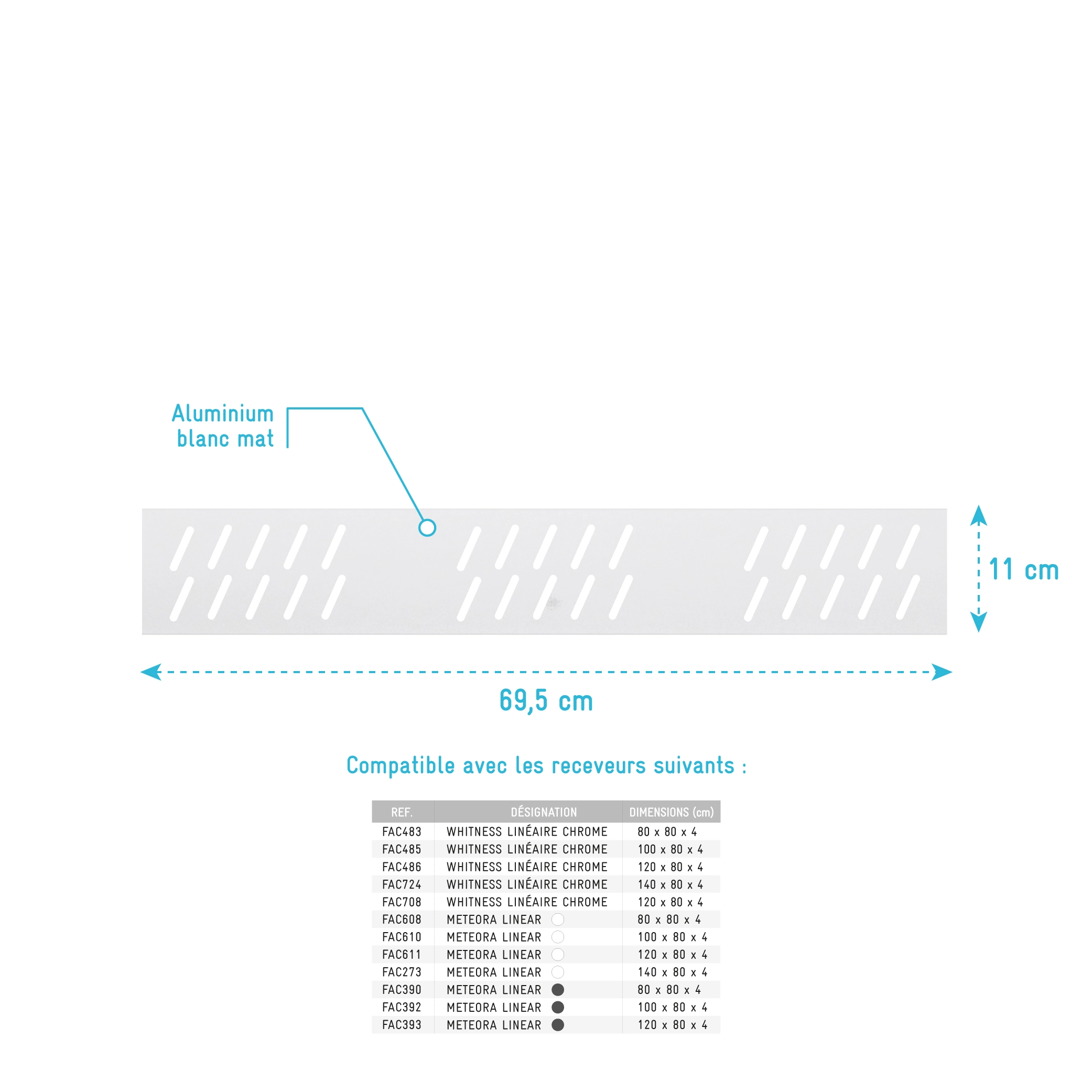 Grille linéaire en Aluminium Blanc Mat pour receveur – 69.5x11x0.2cm