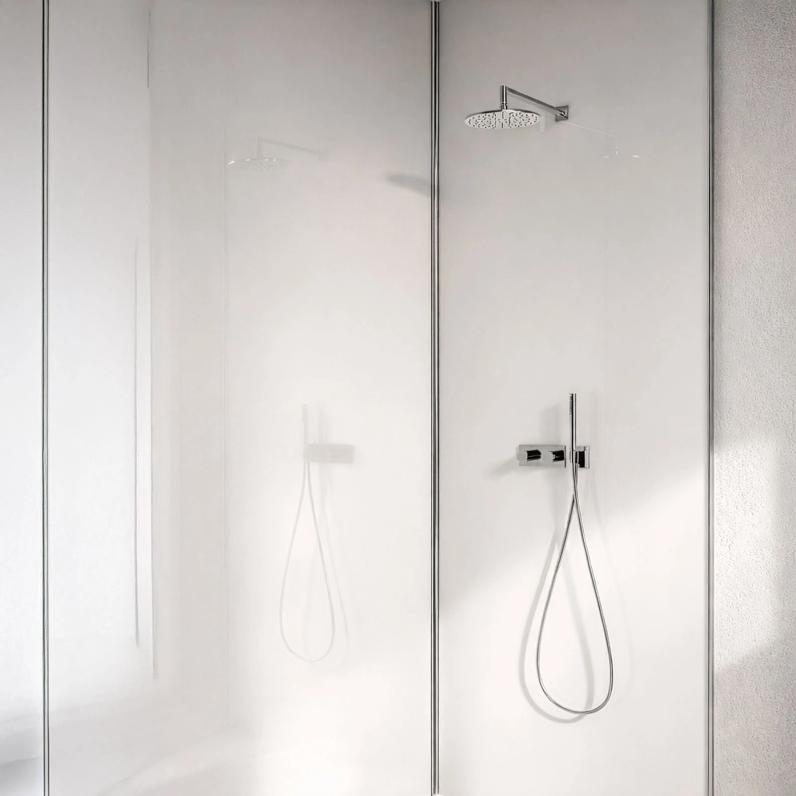 Collez les panneaux à l’aide de mastic PU ou de silicone pour garantir le maintien et l’étanchéité de votre douche. Des bandes de scotch double face permettent de maintenir le panneau le temps du séchage de la colle.