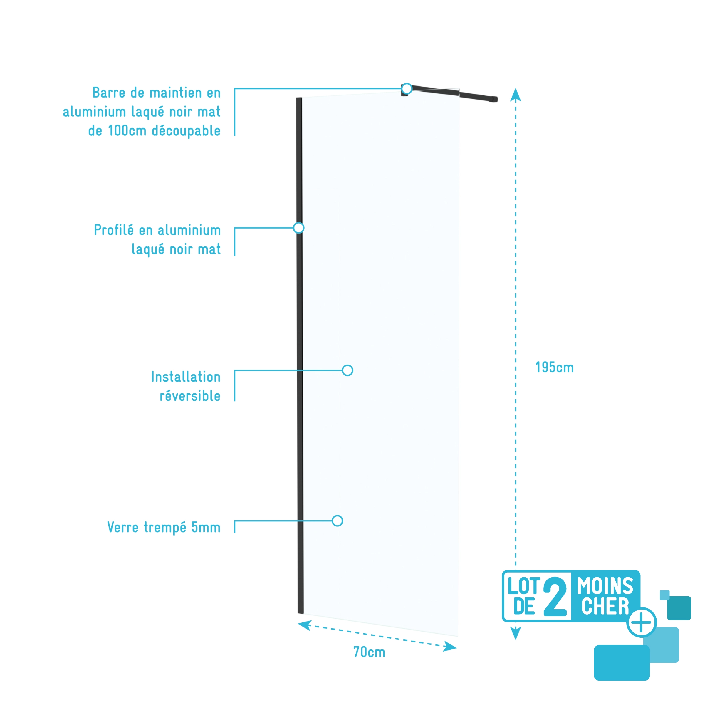0 avis DARK ELEMENTARY LOT de 2 Parois de Douche 70x195 cm en Verre Trempé 5 mm - Profilés et Bras Noirs