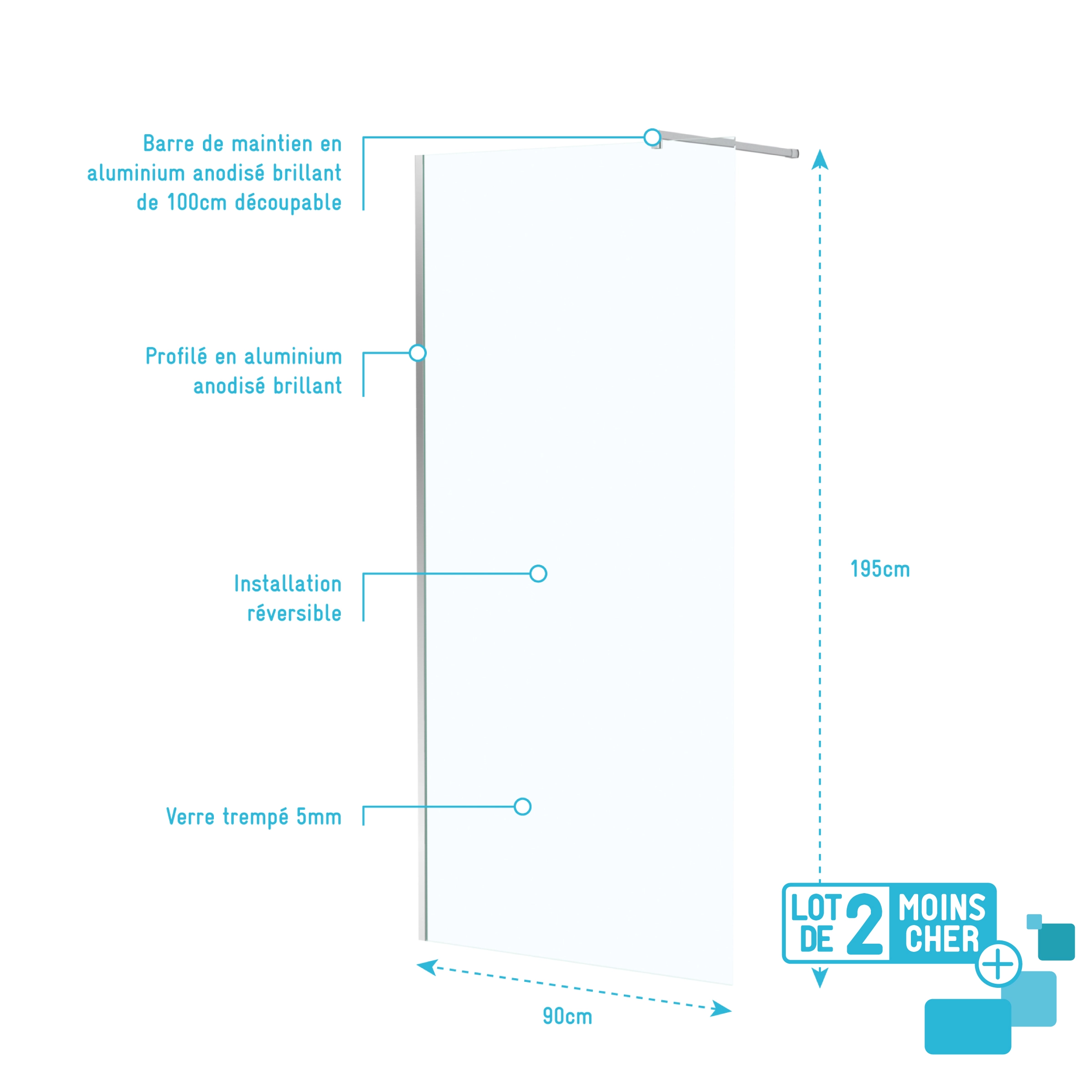 0 avis CHROMED ELEMENTARY LOT de 2 Parois de Douche 90x195 cm en Verre Trempé 5 mm - Profilés et Bras Chromés