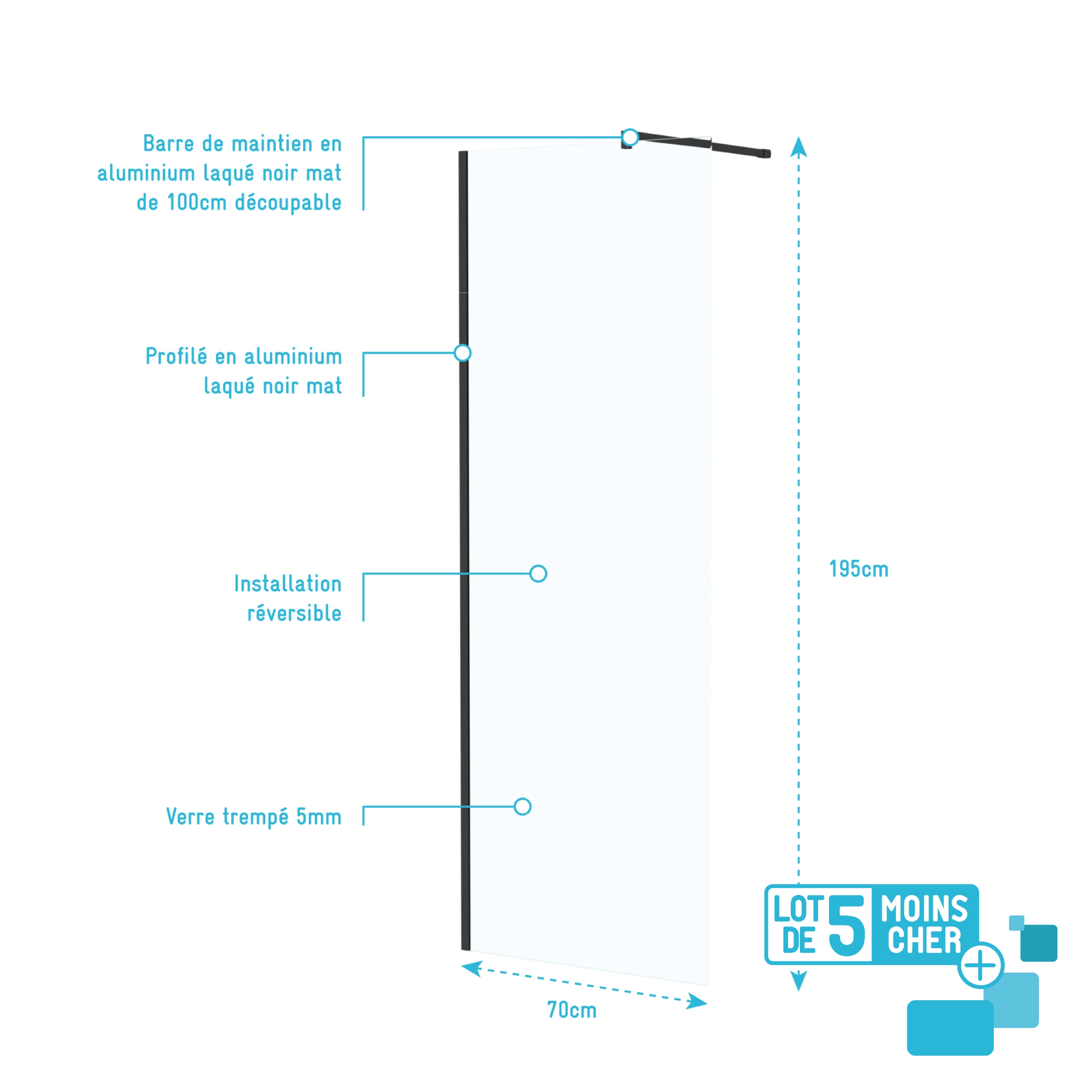 LOT de 5 Parois de Douche 70x195 cm en Verre Trempé 5 mm - Profilés et Bras Noirs