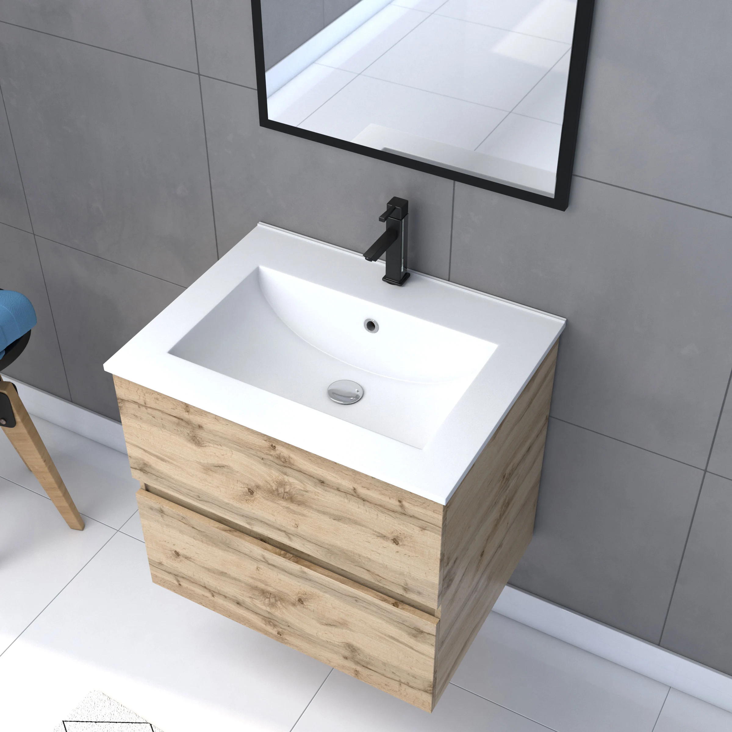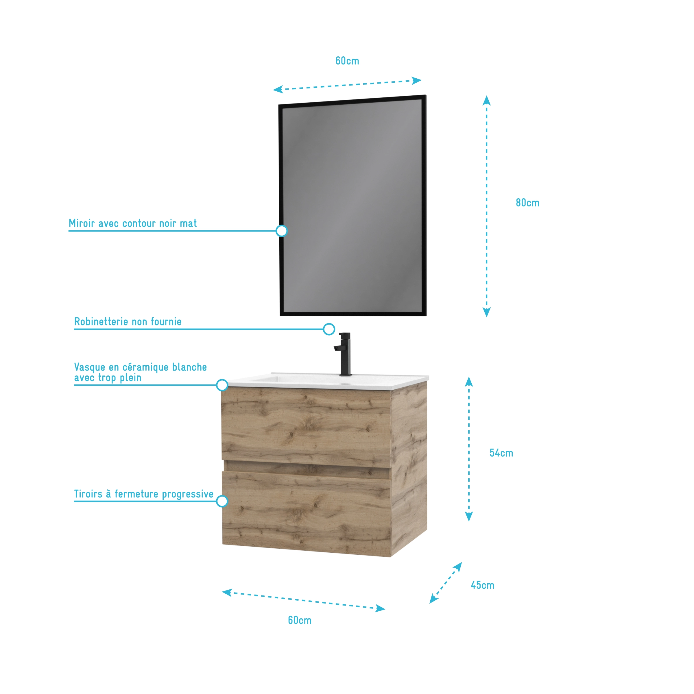 Meuble salle de bain 60x54cm – Finition chene naturel + vasque blanche + miroir – TIMBER 60 – Pack09